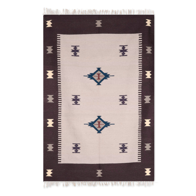 The nights of the Indian region are painted in cordovan and midnight hues. Presented by Sonik Sethi, this classic dhurrie rug portrays one of those gallant nightscapes through a star-themed pattern handwoven by local hands. Fringes complete the piece, allowing a graceful display.