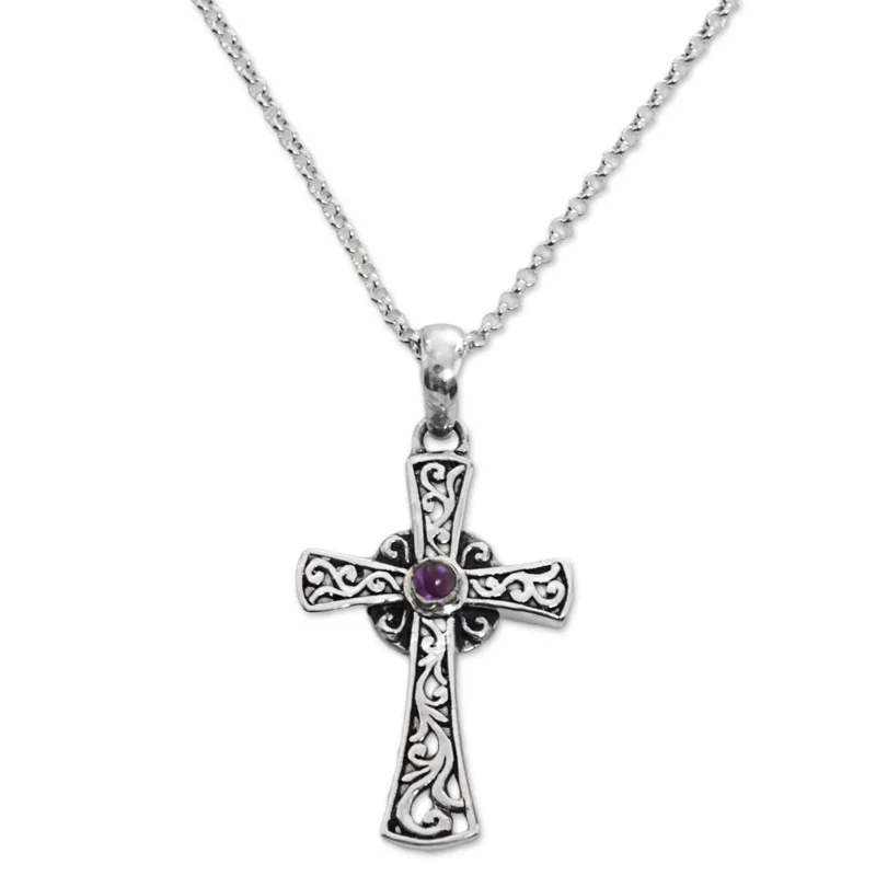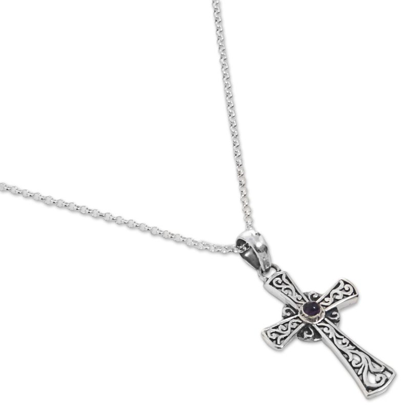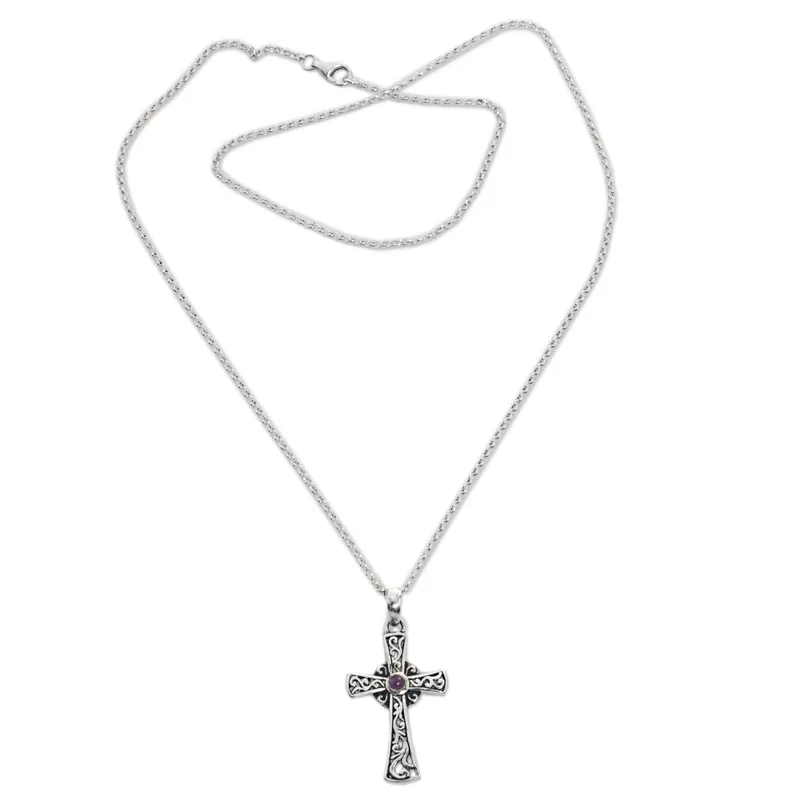 Backed by our 100% Happiness GuaranteeBalinese swirl motifs dance within the shapes of a cross in this elegant and striking pendant necklace. Designed by Indonesia's Wirabhuwana, the necklace features a single stone of purple amethyst that glows from the heart of the cross.