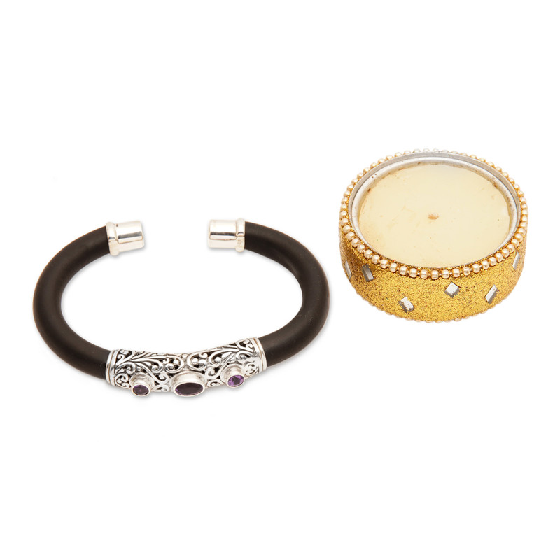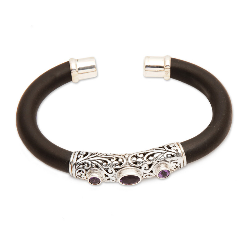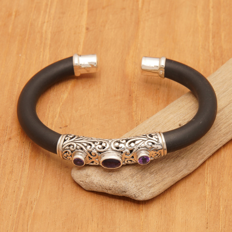 Backed by our 100% Happiness GuaranteeMade with care by local silversmiths, this cuff bracelet reflects the rich culture of Indonesia. Purple stones of amethyst glisten atop handcrafted Balinese motifs in this bracelet, presented by master silversmith Wayan Asmana.