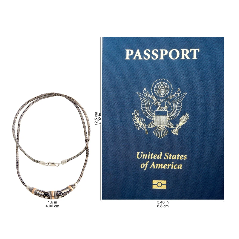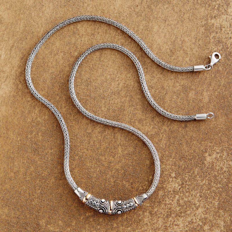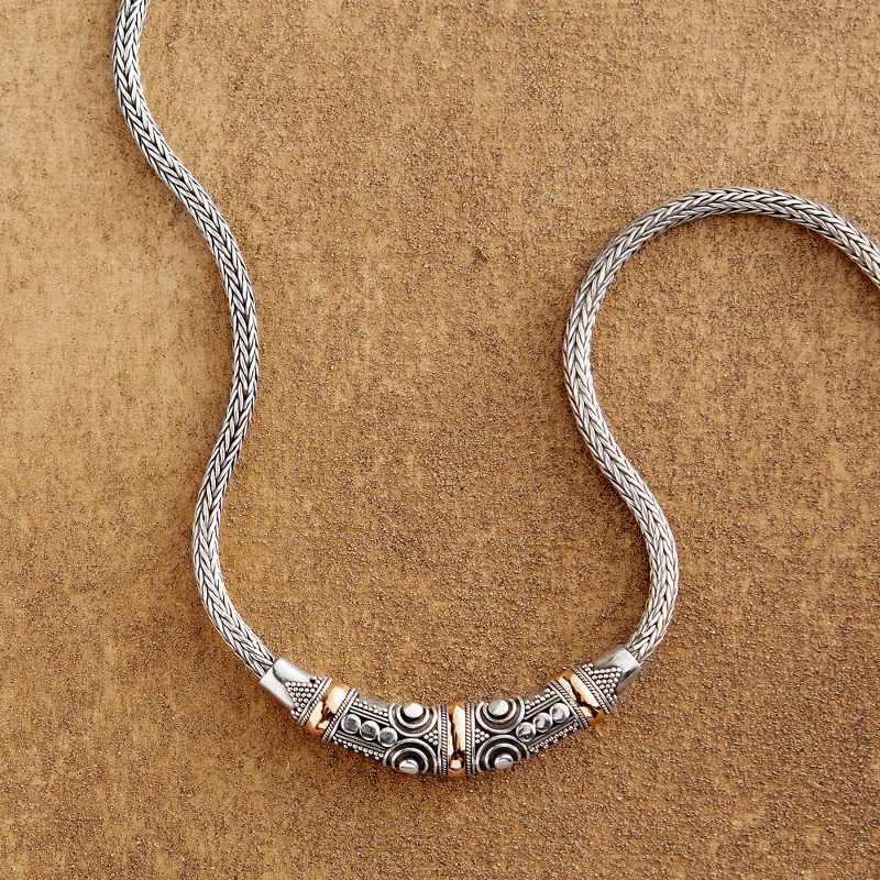 Backed by our Happiness GuaranteeClassic Balinese jewelry techniques are on full display in this elegant two-tone necklace handcrafted in the village of Celuk. Curling wirework and small silver droplets called jawan are delicately placed by hand using tiny tweezers to create elegant and versatile jewelry you'll turn to every day. 18-karat-gold plated bands complement the selectively oxidized sterling silver.