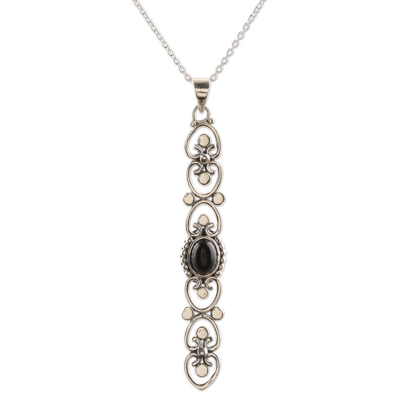 Cultivate an aura of elegance wearing this unique pendant necklace designed by Neetu Barathi. Crafted from sterling silver by Indian artisans, the pendant features a vertical row of openwork hearts centered by an oval onyx gemstone in a bezel settings.