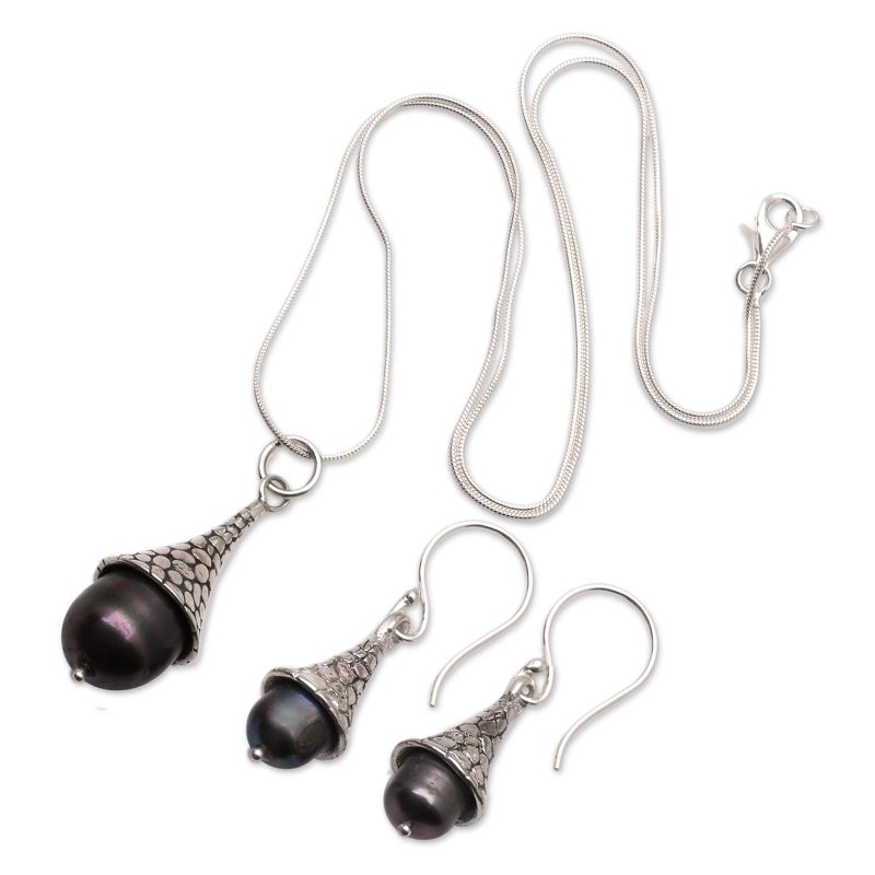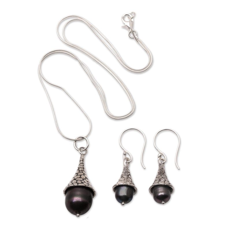 Backed by our 100% Happiness GuaranteeCoordinate your outfit with ease wearing this set of matching jewelry designed by Indian artisan Ketut Sulastri. Hand crafted with sterling silver, the set includes a pendant necklace and a pair of dangle earrings, both accented with cultured freshwater pearls.