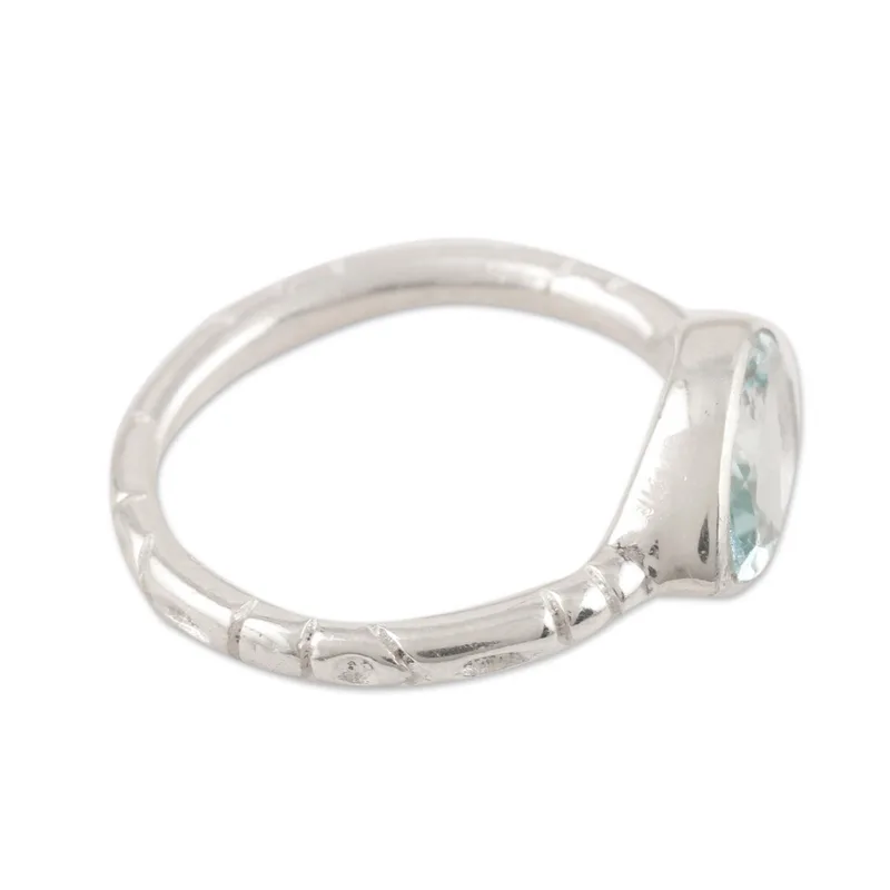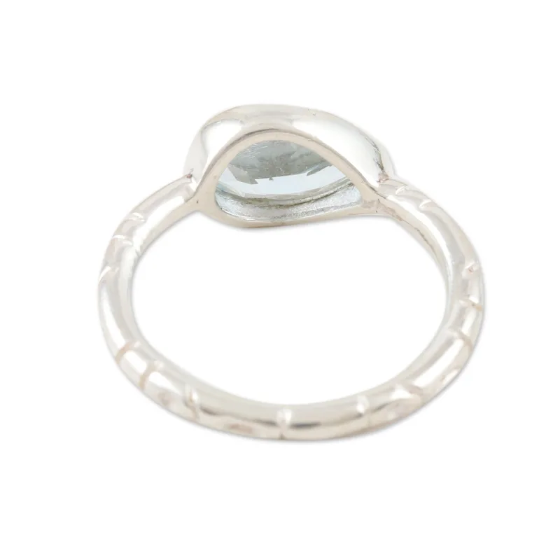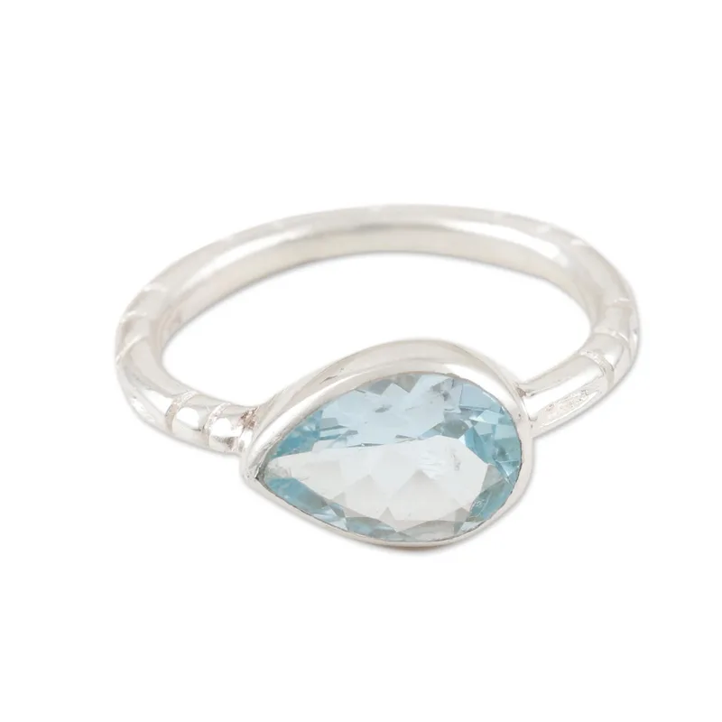 A translucent blue teardrop sparkles at the center of Neetu Barathi's lovely ring. The Indian artisan crafts the ring's band from notched sterling silver, topping the piece with a faceted blue topaz gemstone in a bezel setting.