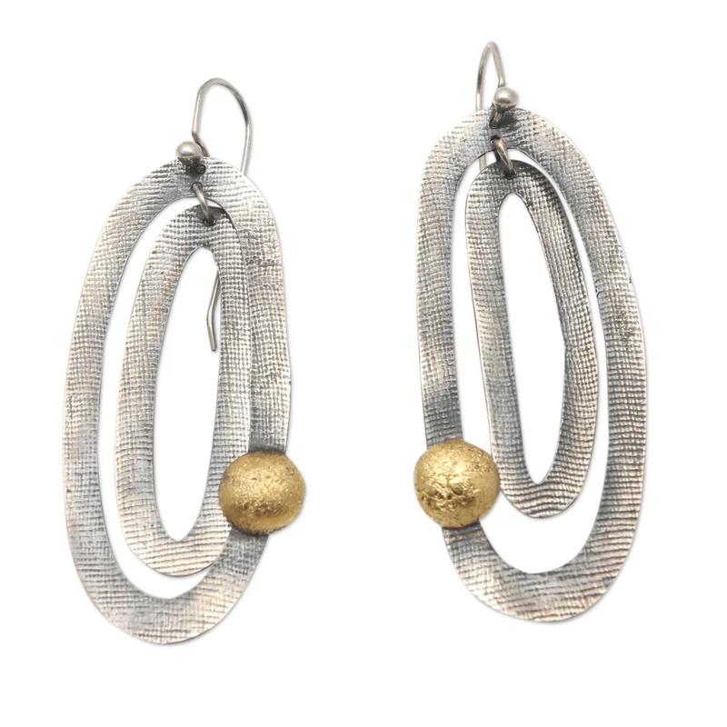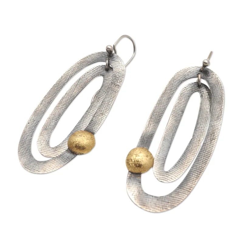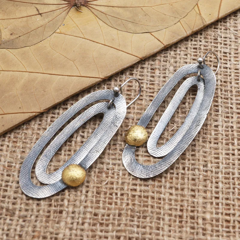 Using Bali's moonlit Nusa Dua or Waterblow Beach as inspiration, Wayan Sriani crafts these contemporary dangle earrings under the Pertiwi Collection, named for the national personification of Indonesia, "the Mother Nature of Indonesia". From her workshop, the artisan crafts the unique earrings from rings of sterling silver finished with an oxidizing polish, and a shining brass orb.