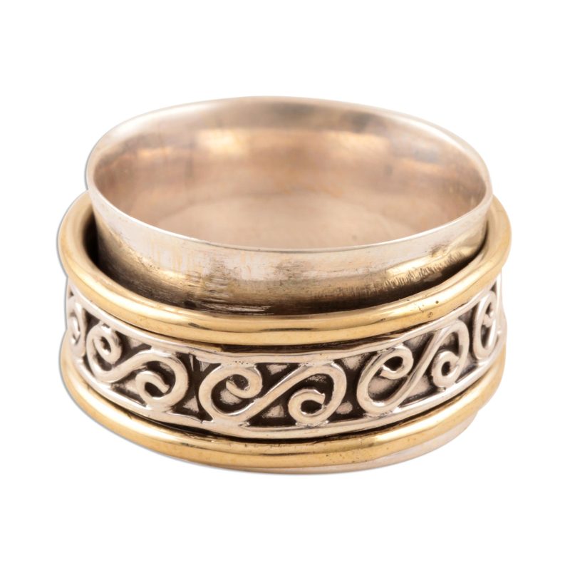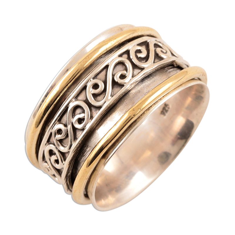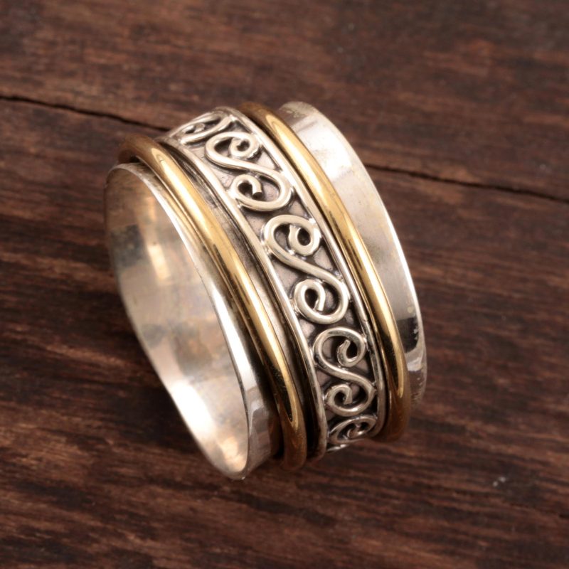 Flanked by petite brass bands, a band of sterling silver displays intricate swirl patterns. Shivani Choudhary designs this Indian spinner ring, which circles the finger with a wide sterling band.