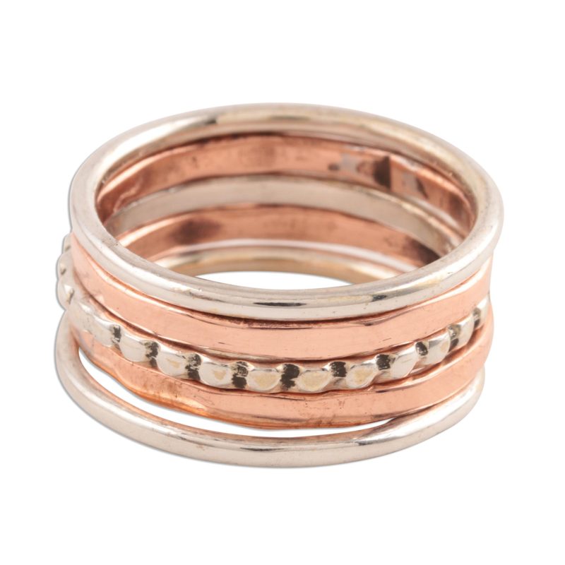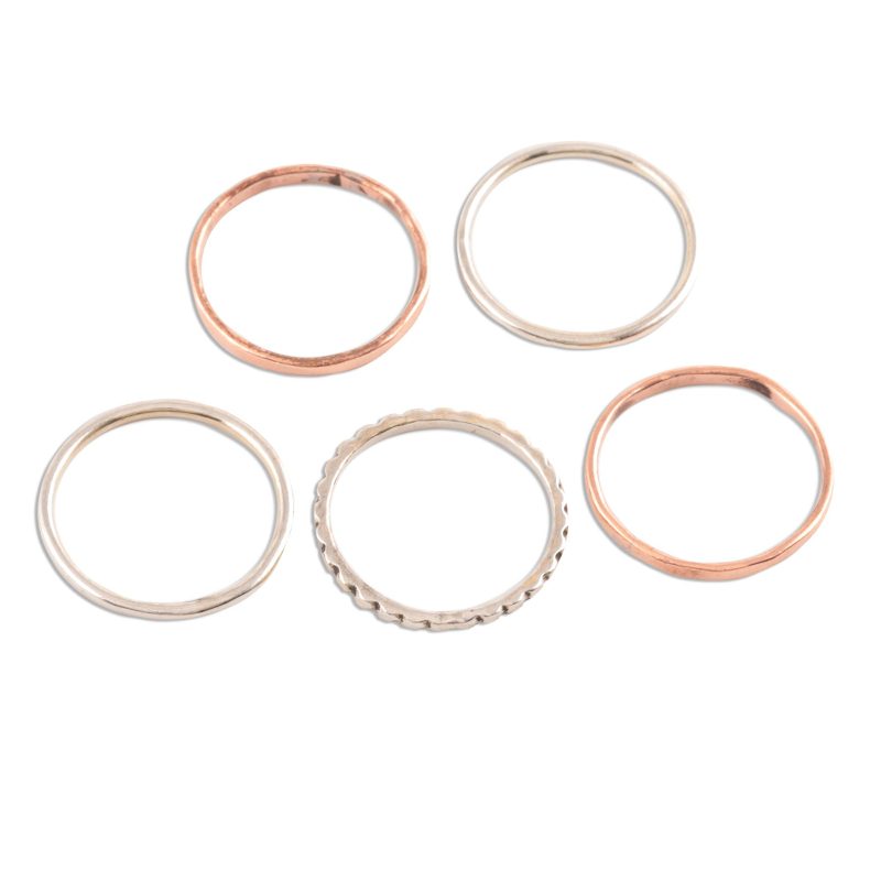 Backed by our 100% Happiness GuaranteePerfect for wearing together or sharing with friends, this set of five rings is designed by Shivani Choudhary in India. Three rings are crafted from sterling silver while two are crafted from copper; each ring showcases a different shape and finish.