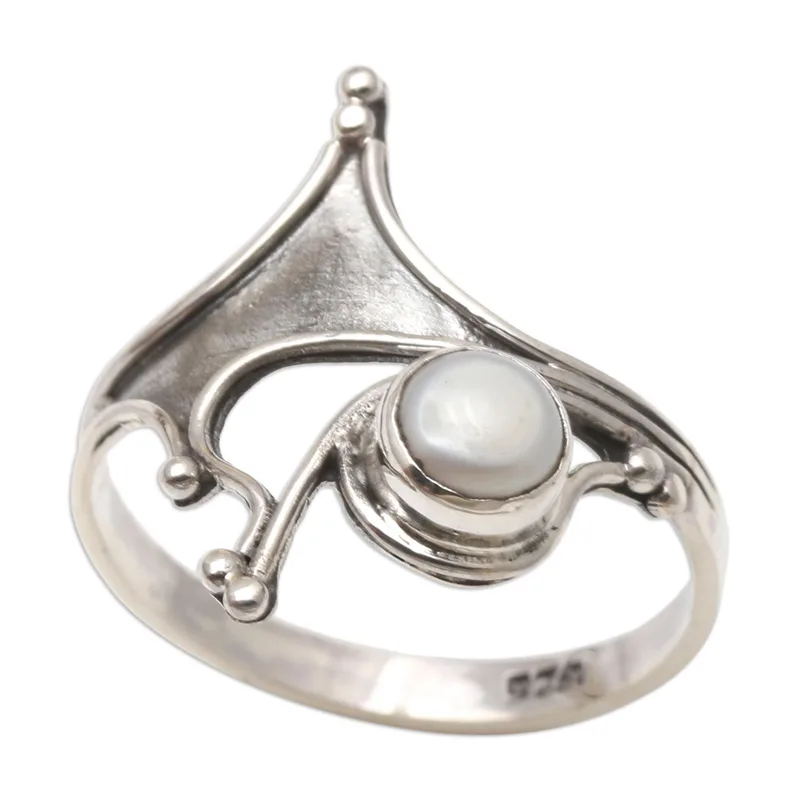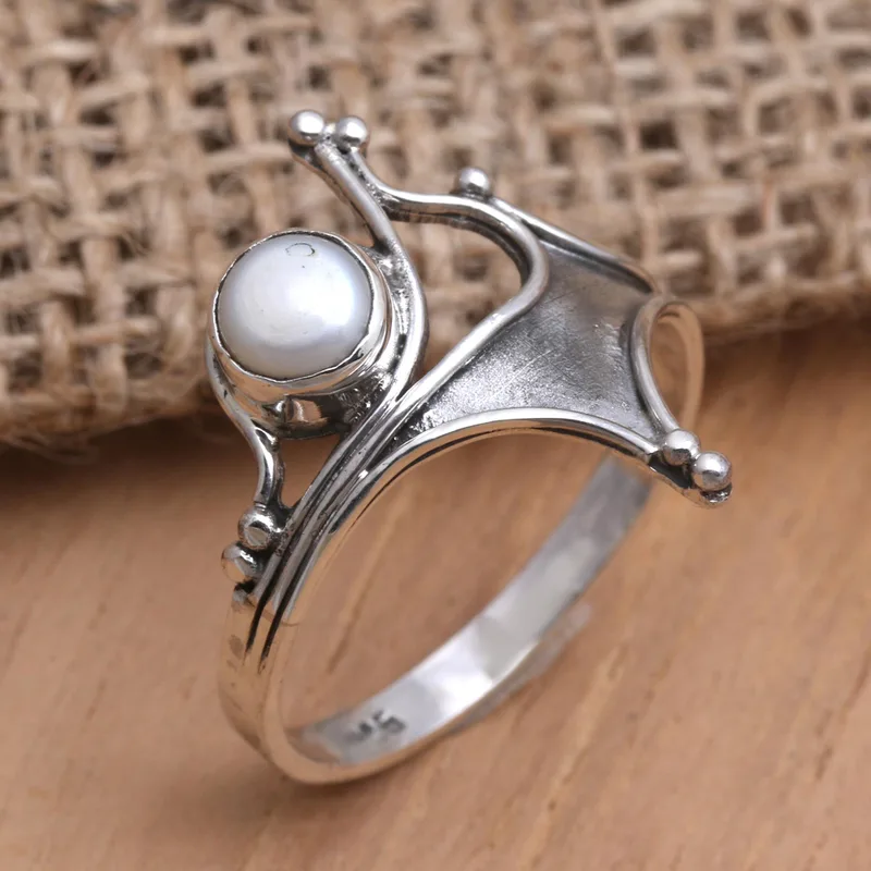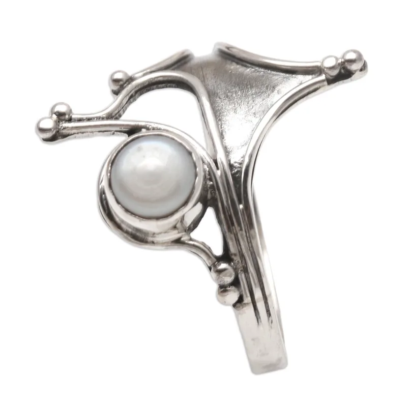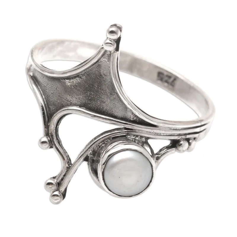 Crown yourself queen with Budiharta's regal cocktail ring. Using a crown for inspiration, the Balinese artisan designs then crafts the ring from polished sterling silver in graceful arcs. An off-center cultured freshwater pearl glows, completing the ring with a luxurious detail.