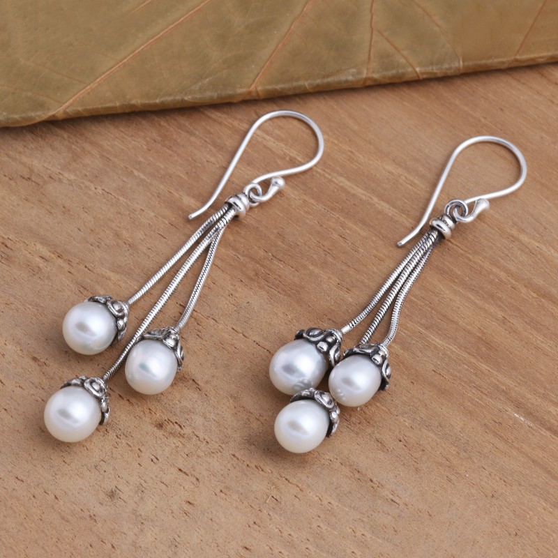 Three cultured freshwater pearls hang seductively from sterling silver cords in these magnificent dangle earrings. Hand crafted by Bali's Diah Arini, the earrings add a sumptuous touch to a late-night dinner or a dressy evening at the theater.