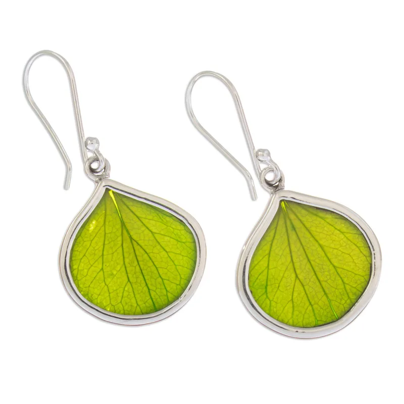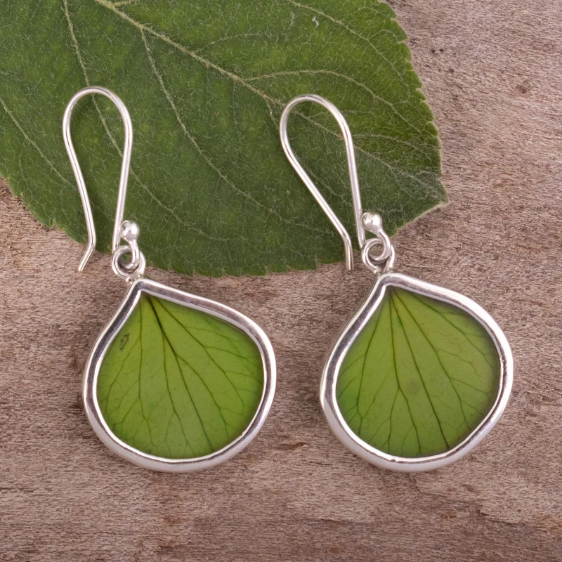 Peruvian silversmith Jose Luis Pariona creates these unique earrings. Inspired by summer's bounty, he immortalizes natural hydrangea leaves — dyed spring green — in Andean silver. The delightful droplets dangle from sterling hooks.