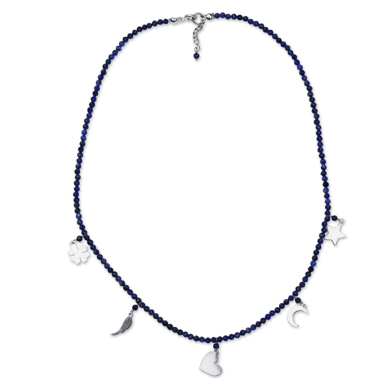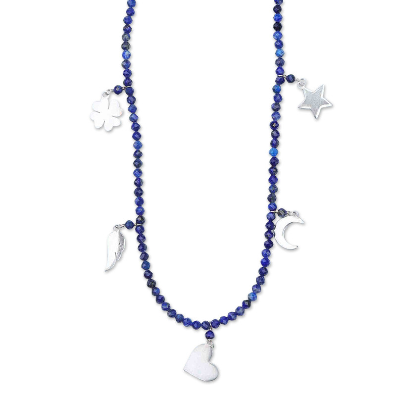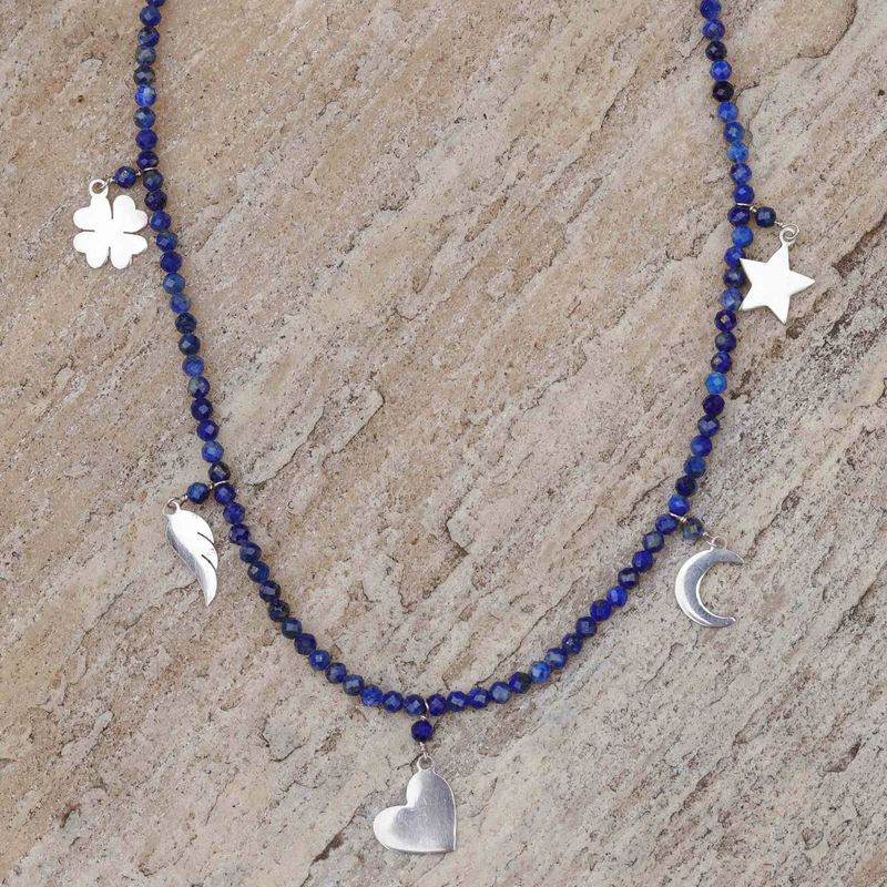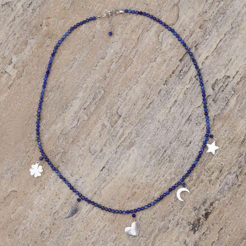 You can find our lapis lazuli beaded charm necklace 'Royal Inspiration' by Liliam Vivan in jewelry categories such as Gemstone Necklaces, Birthstone Necklaces, Good Luck Necklaces, Star Necklaces and Sun and Moon Necklaces. Enjoy exploring these sections for other Novica treasures.