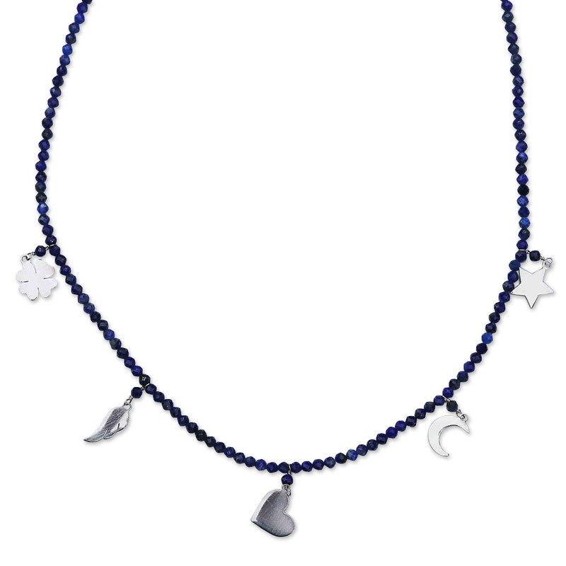 Backed by our 100% Happiness GuaranteeWear a trendy and luxurious style with this gorgeous charm necklace featuring little sterling silver accents. Brazil's Liliam Vivan adds a high polish finish to each little dangle motif, finishing the accessory with multiple lapis lazuli beads symbolizing royalty and wisdom.