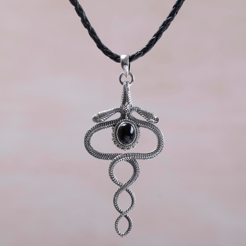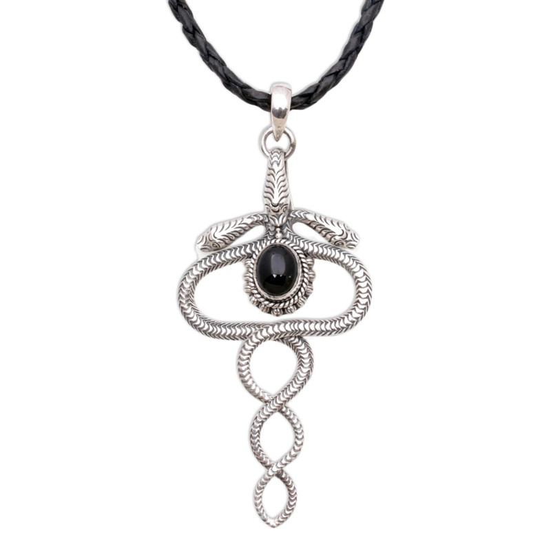 Intertwining their sinuous bodies, twin serpents protect a black onyx oval. Yuniati contrasts the sleek gem with the snake's intricate scales. This novel pendant is worn on braided black leather.