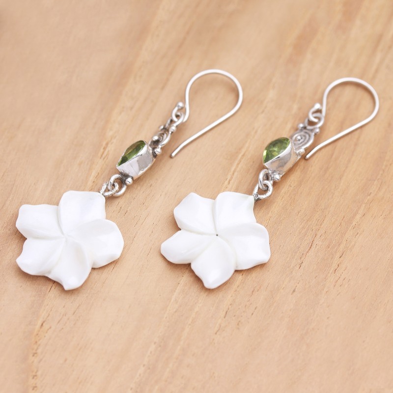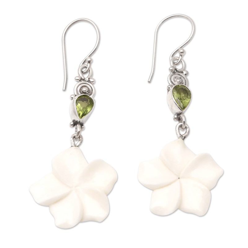 Backed by our Happiness GuaranteeThe pale flowers and green gems on Ayu Ary's dangle earrings make these an easy choice for a breezy spring day. The Balinese artisan hand carves the flower from natural bone, while a faceted peridot gemstone in a bezel setting hangs under sterling silver accents.