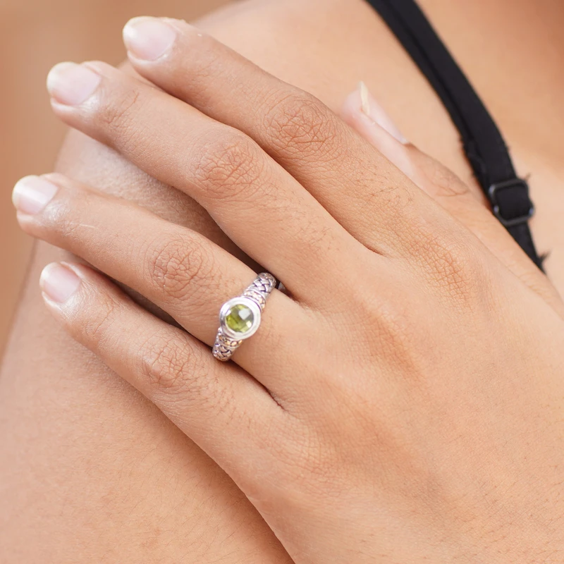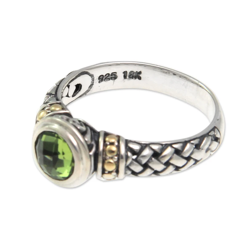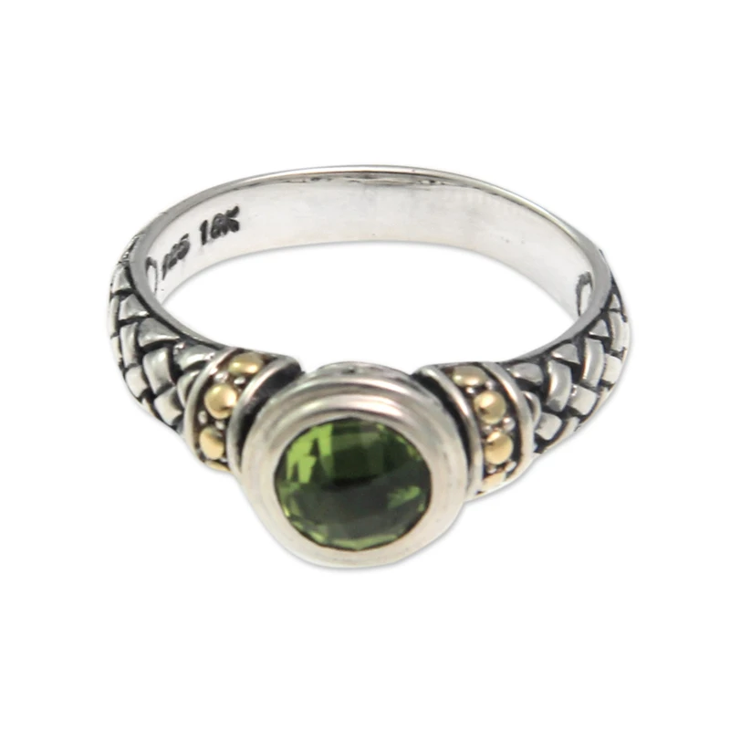 Balinese designer Lenny casts a spell of exquisite elegance with this ring. Crafted of sterling silver, the ring features woven textures and 18k gold plated suns. The ring is crowned with a glistening peridot, gem of lightness and beauty.
