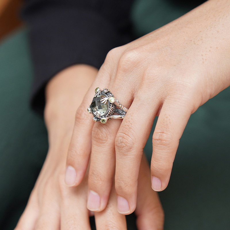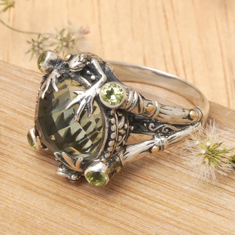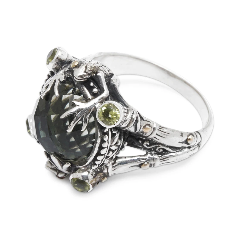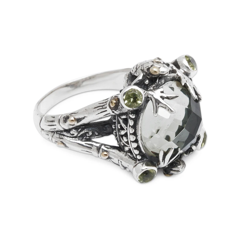 Crafted by hand in a novel ring by Kadek Hendra, shining silver frogs sing of summer rain. They cling to a lily pad of cool green prasiolite and feature eyes bathed in 18k gold. Faceted peridot surrounds the crown, and the gemstones total 6 carats.