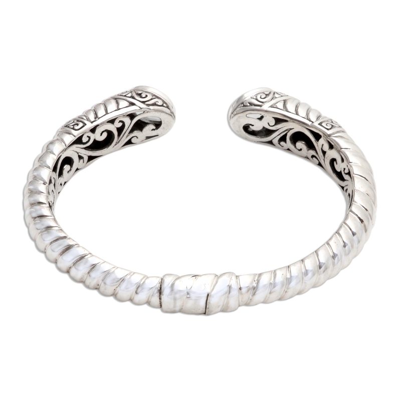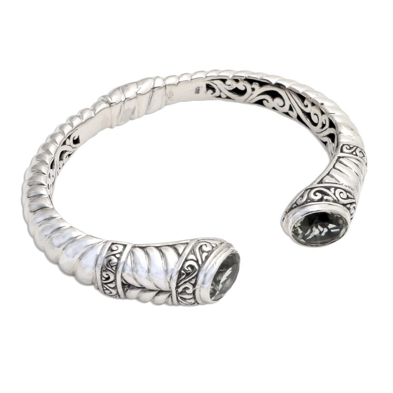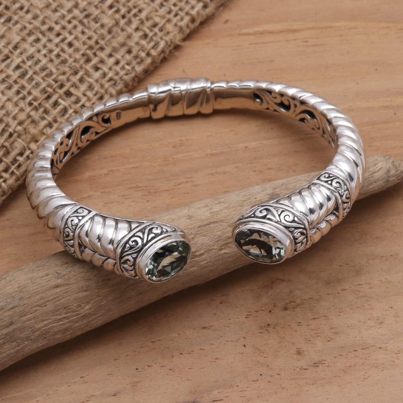 Sparkling prasiolite gems totaling over nine carats crown the ends of this gorgeous cuff bracelet. Designed by Bali's Kadek Hendra, the cuff is crafted of sterling silver with a cleverly concealed hinge that makes it easy to put on and take off.