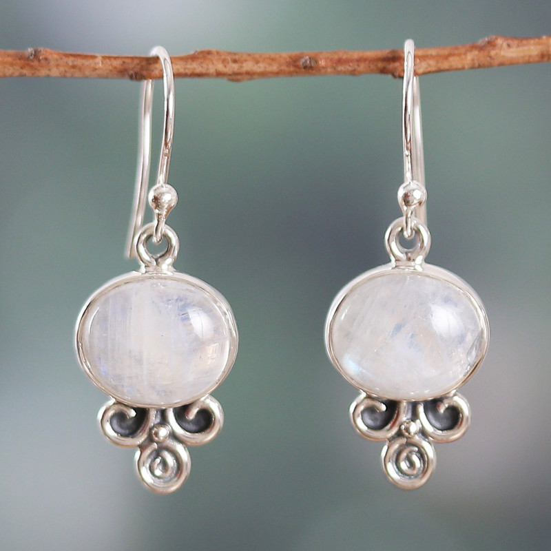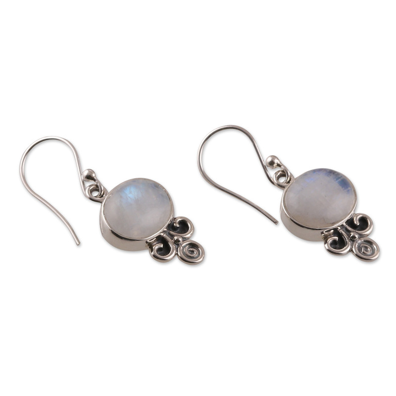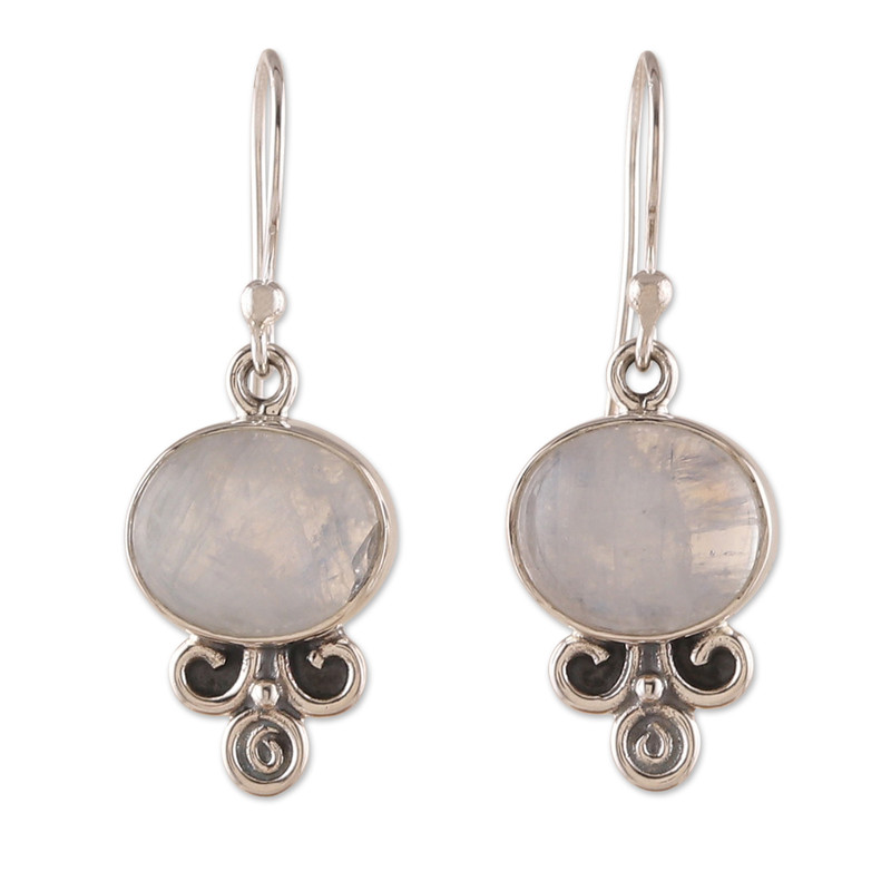Transform any outfit with these ethereal dangle earrings featuring enchanting rainbow moonstones displaying radiant hues. Presented by India's Shanker, these captivating accessories showcase elaborate sterling silver designs decorated with a seamless blend of darkened and lustrous finishes, ensuring graceful beauty.