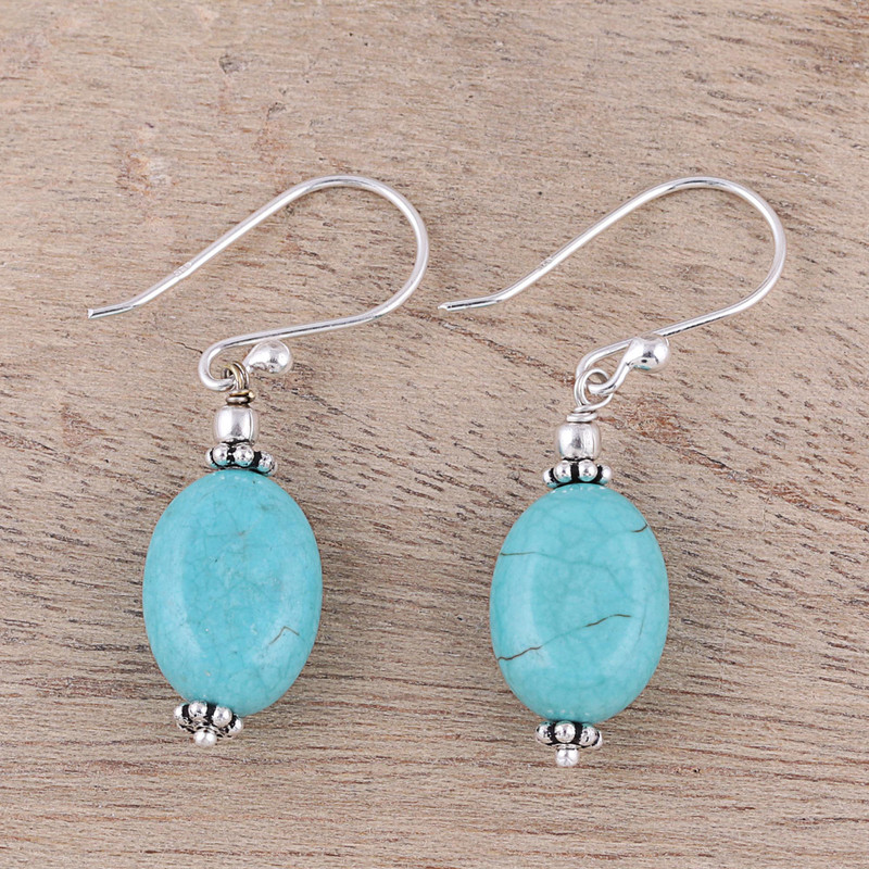 India's Narayannii presents a pair of earrings that evokes the peaceful stillness of a cloudless sky. Sky blue reconstituted turquoise is framed by sterling silver details, glinting in the light as they move. The classic combination of sky blue and metallic silver bring a pop of color to your outfit.