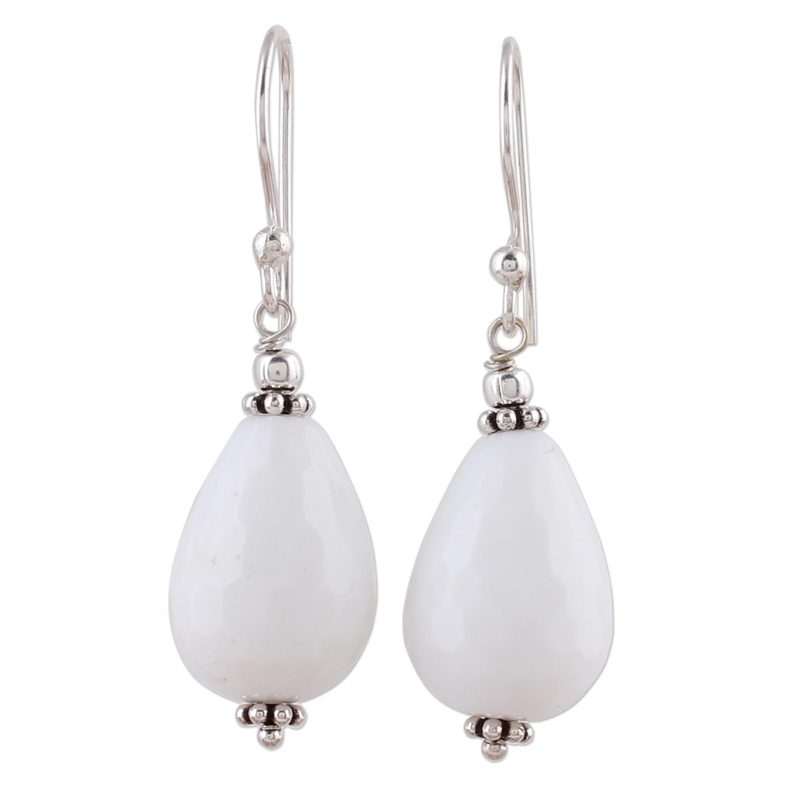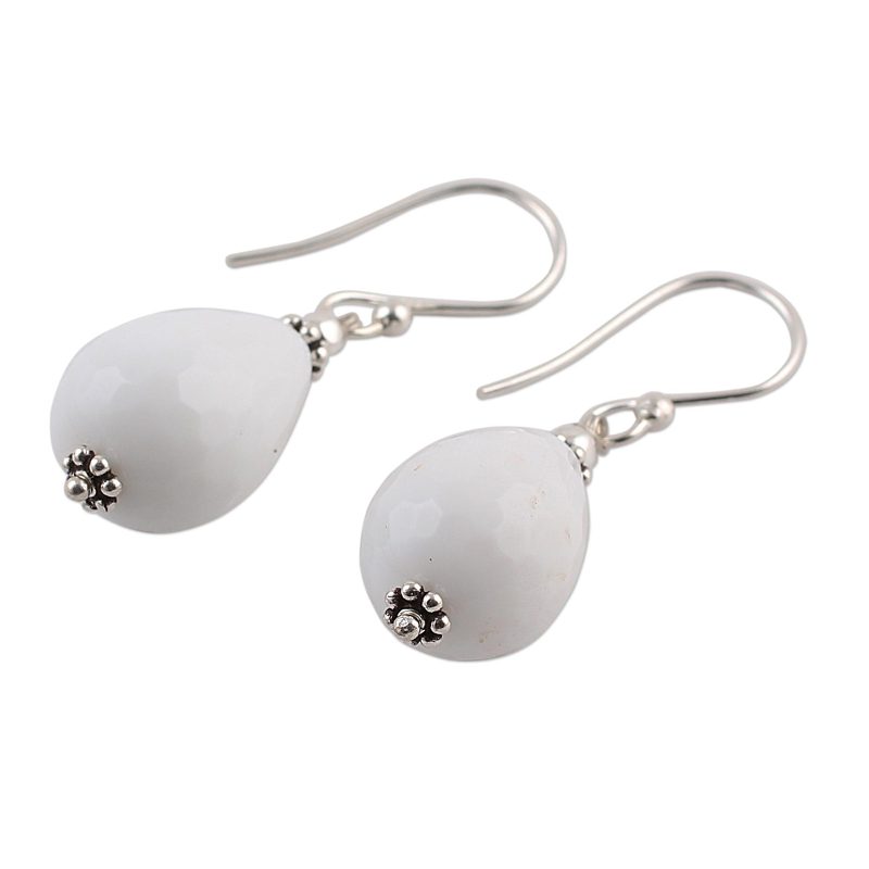 White drop-shaped agates dangle beneath sterling silver hooks in this beautiful pair of earrings. Designed by Narayannii of India, the earrings are embellished by sterling silver dot motif beads. Radiant and simple, the earrings makes an elegant and eye-catching accessory.