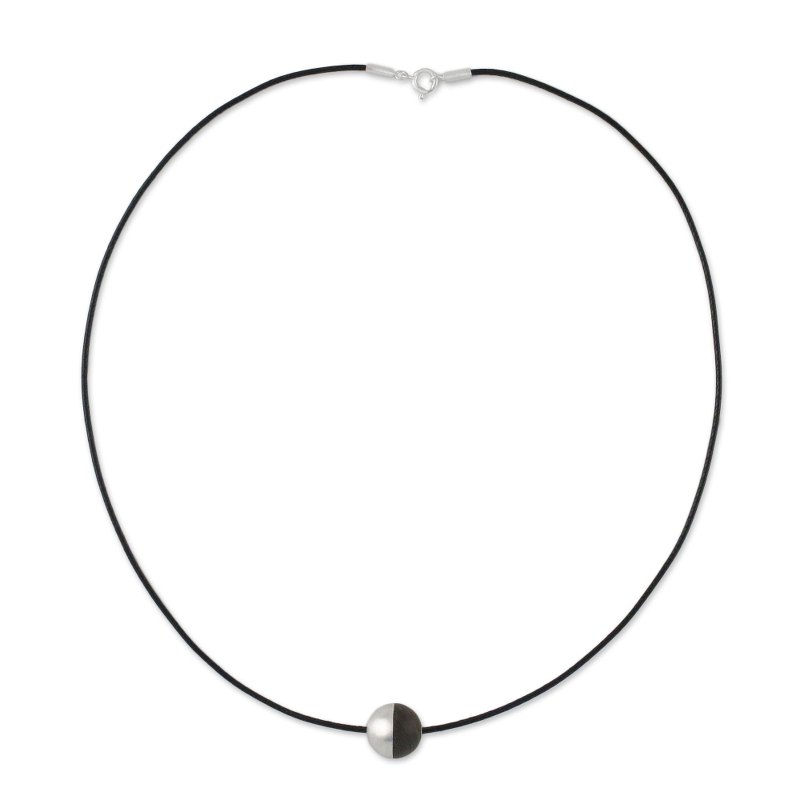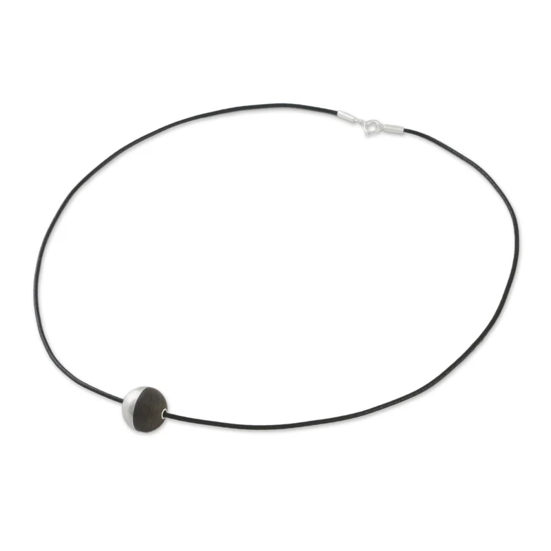 For a modern necklace, Thai artisan Sarote Lochotinunt combines the beauty of sterling silver and wood. Centering a length of cord, a circular pendant is divided between sterling silver with a brushed-satin finish and dark Indian elm wood.