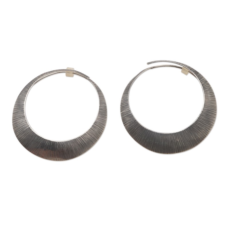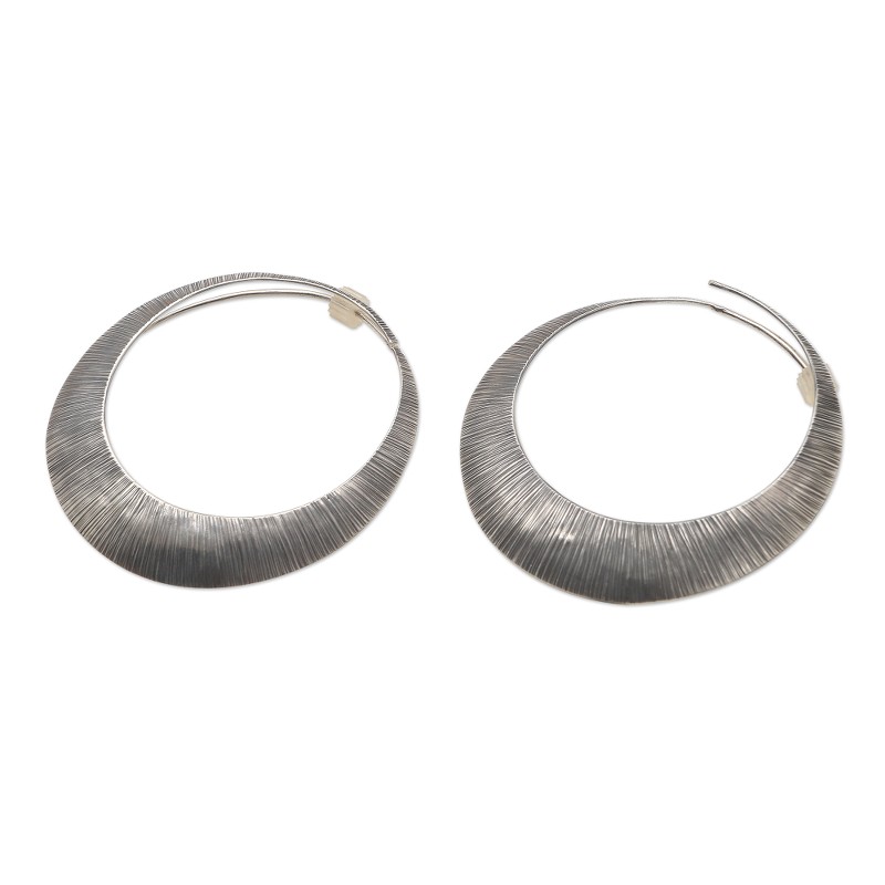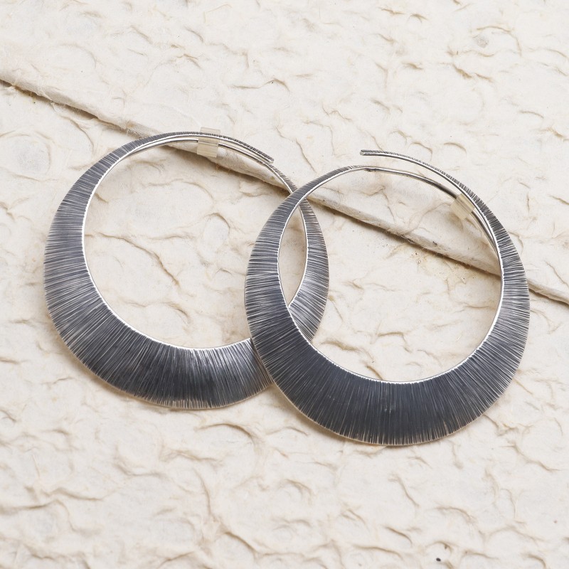 Using the dim light of an eclipse for inspiration, Wayan Sriani crafts these beautiful hoop earrings under the Pertiwi Collection, named for the national personification of Indonesia, "the Mother Nature of Indonesia," as the artisan put it. From her workshop, the artisan crafts the unique earrings from rings of sterling silver finished with an oxidizing polish that gives the pair an antique look.