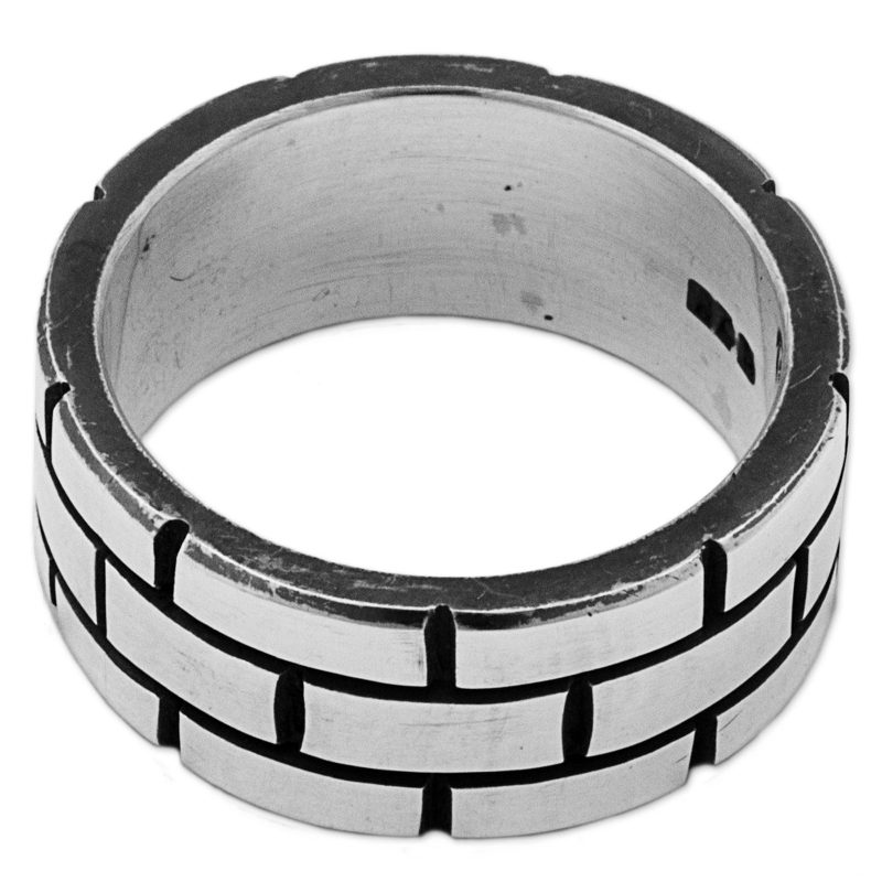 By Mexican artisan Angel Ortiz, this ring is crafted from sterling silver mined in Taxco. Brick-shaped motifs cover the surface of the bold and striking band.