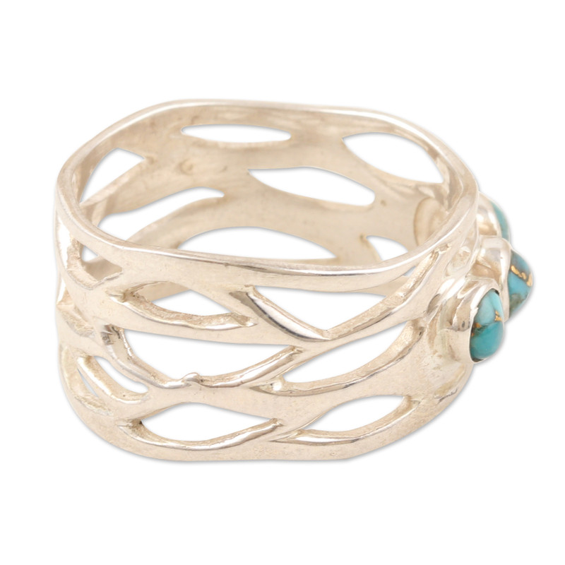 Working with sterling silver, India's Bhavya Jain creates this precious band ring in a high polish finish. After making the unique sinuous structure, the artisan adds three reconstituted turquoise stones that add a refreshing tone to the piece.