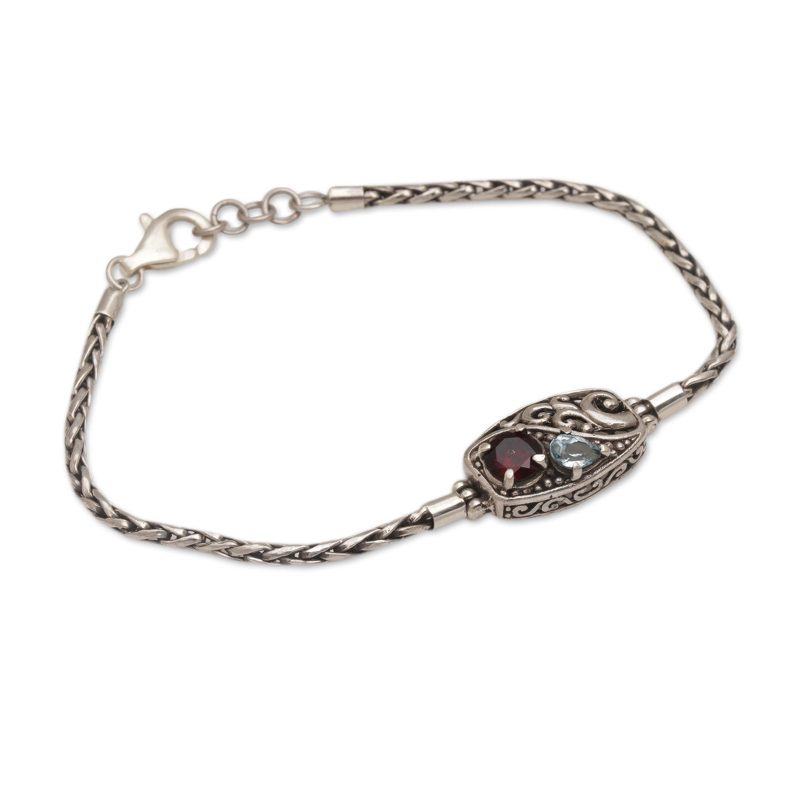 Backed by our 100% Happiness GuaranteeDiah Arini captures a powerful sea in this exquisite bracelet. Sterling silver wheat chain creates a feminine band that frames a gorgeous focal pendant. The center sparkles with two carats of dazzling blue topaz and garnet as it pairs with the crashing waves of the ocean.