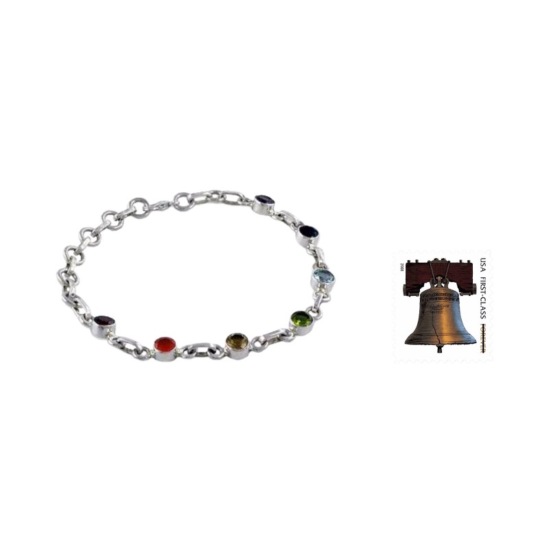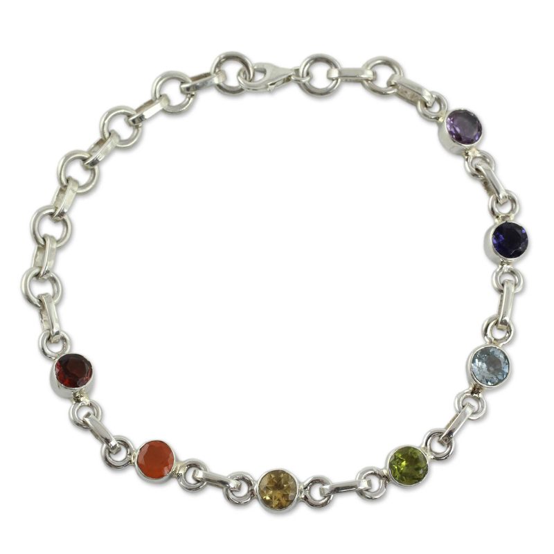 From Alok Jain, this sterling silver bracelet links colorful gems associated with chakras. Set in sterling silver, amethyst, iolite, citrine, peridot, garnet, blue topaz and carnelian total 4.2 gemstone carats. Clear and light purple stones are associated with the 7th chakra (awareness and wisdom); the purple, violet and indigo gems with 6th chakra (insight and perception), and the blue or light blue with the 5th, that of communication and truth. Green and pink stones are for love and compassion, linked to the heart, on the 4th chakra. For inner power and will, the 3rd chakra is associated with yellow gems, whereas emotion and sexuality are linked to red and orange gems for the 2nd chakra. Black gems are used to stimulate the 1st chakra, that of stability and security.