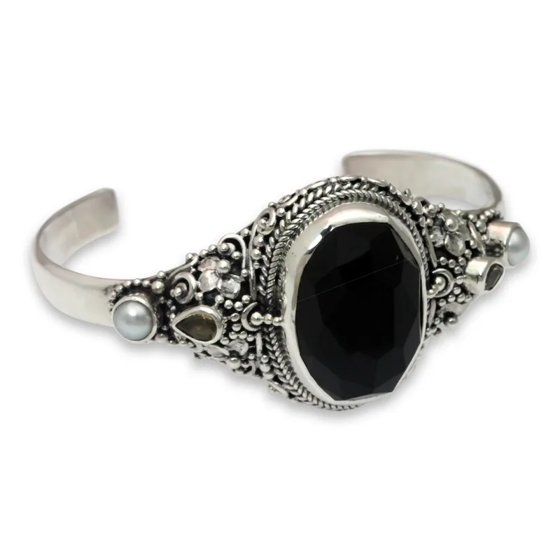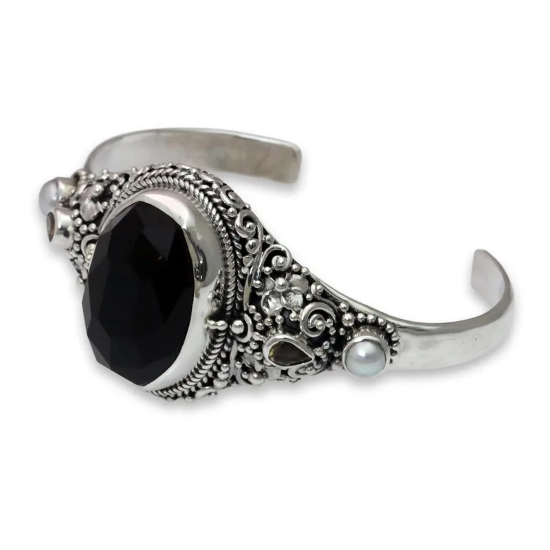 Buana designs a bracelet of ravishing beauty where gemstones nestle among sterling silver frangipanis. Detailed with Balinese artistry, the handcrafted cuff bracelet is crowned with faceted onyx escorted by silvery white pearls and citrine.