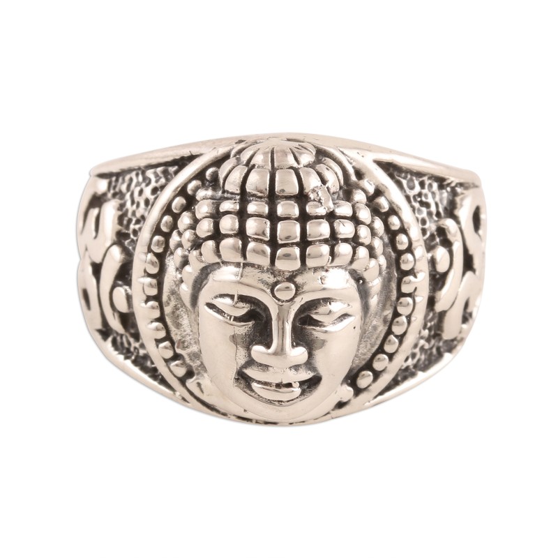 Backed by our 100% Happiness GuaranteeCalm and meditative, the face of Buddha centers this band ring from India. Bhavya Jain designs this spiritual ring, which displays om symbols that flank the portrait of Buddha.