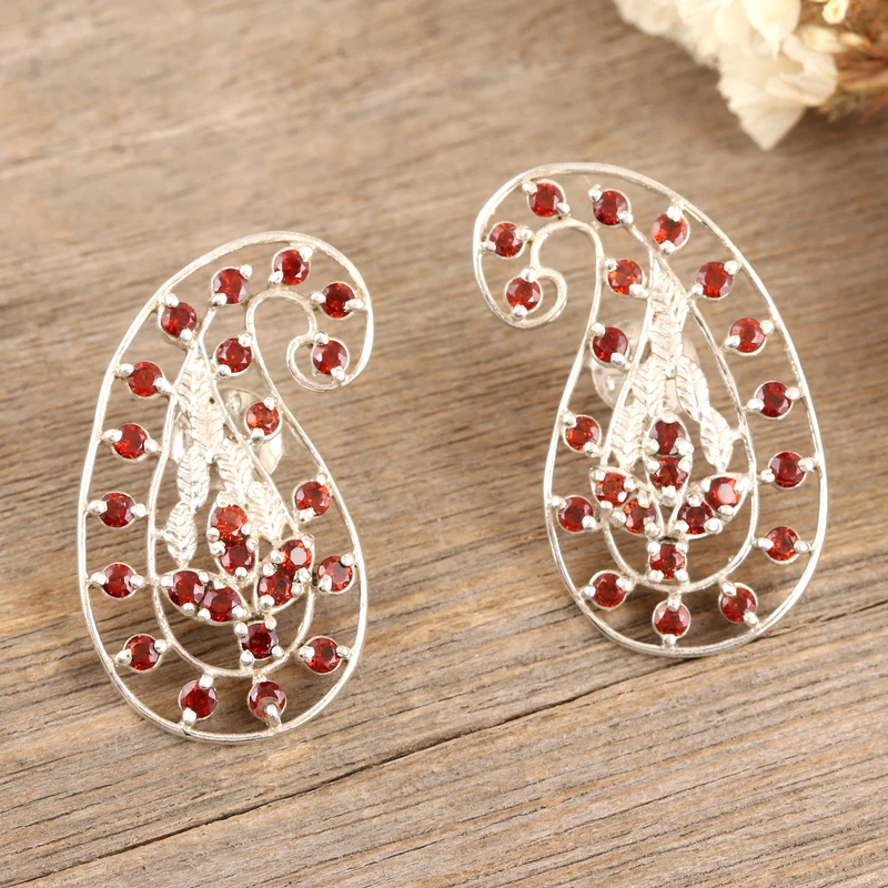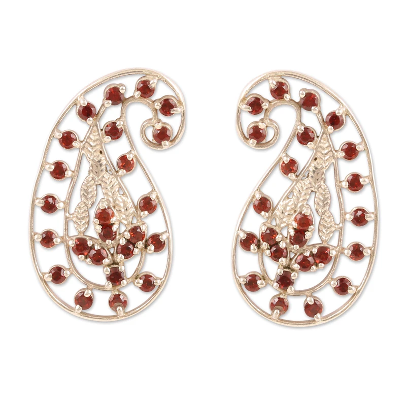 Backed by our 100% Happiness GuaranteeNatural garnet stones embellish a windy design handcrafted by Indian artisans. Each little gem adds a passionate aura to these sterling silver button earrings, making a dazzling creation perfect for any occasion. Presented by Parul, the item also features leafy motifs at the center.