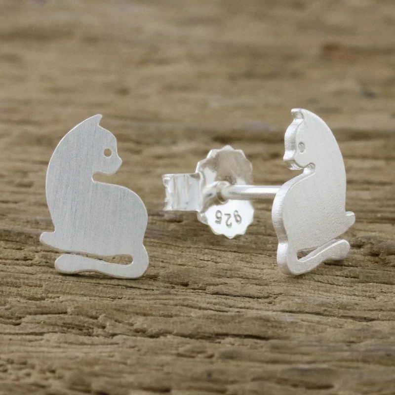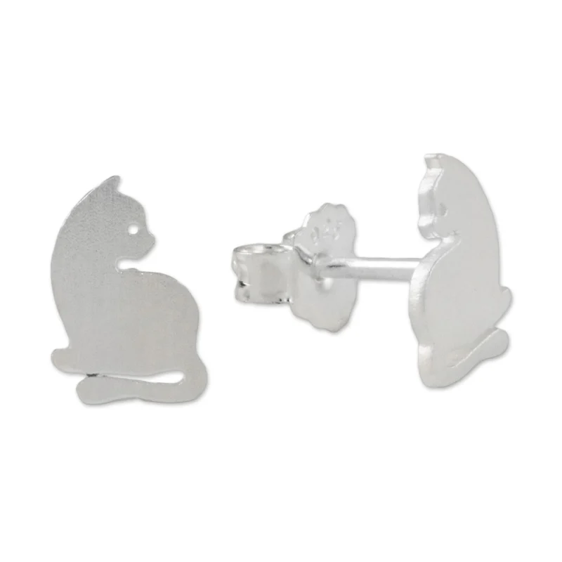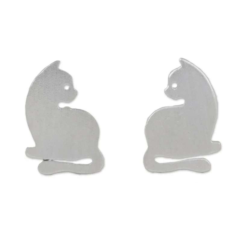 Sitting leisurely, two relaxed cats adorn the ears in this pair of stud earrings from Thailand. Jantana creates the earrings, crafting them of sterling silver with a brushed-satin finish.