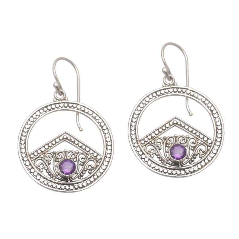 Dessy Kumala of Indonesia designs these ornate sterling silver dangle earrings. Nestled in a ring of sterling silver is a faceted amethyst surrounded by scrollwork, with a dot motif accentuating the design throughout.