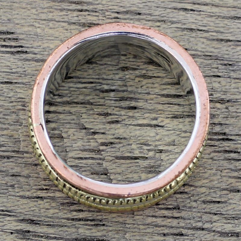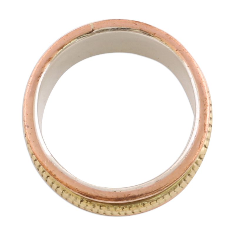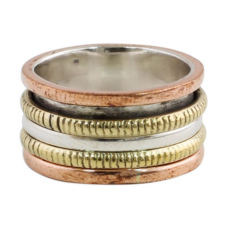 Backed by our 100% Happiness GuaranteeWith a sterling silver band, this meditation ring from India features spinning sections of brass and copper with a textured, combination finish. Neetu Barathi designs the spinner ring, relishing each new opportunity to realize new ideas.