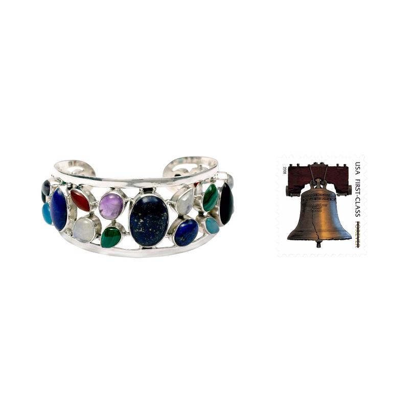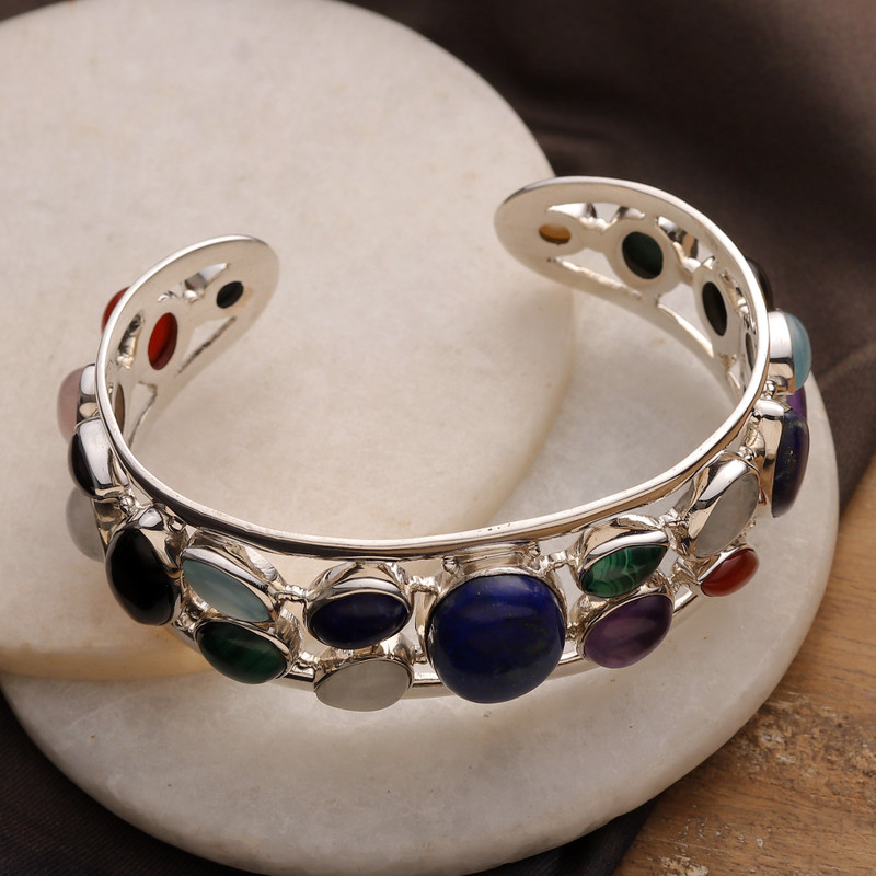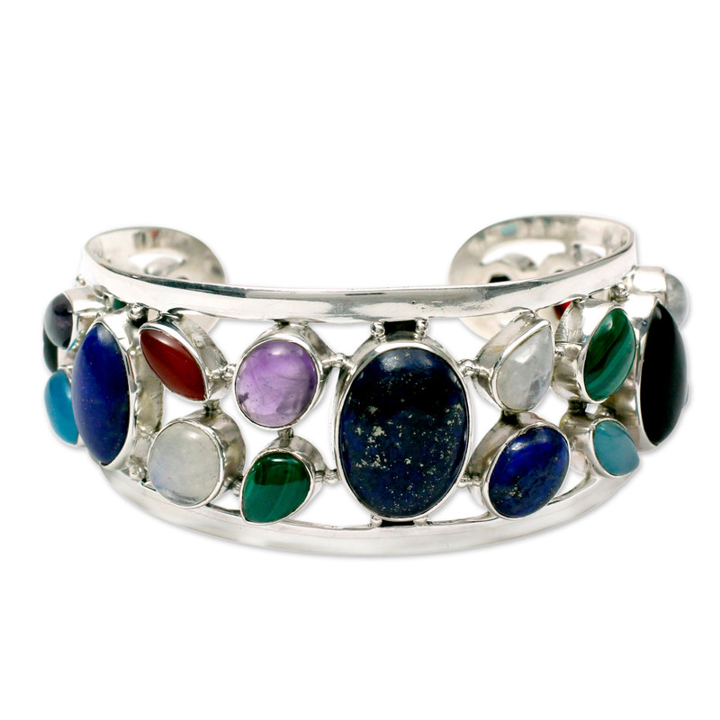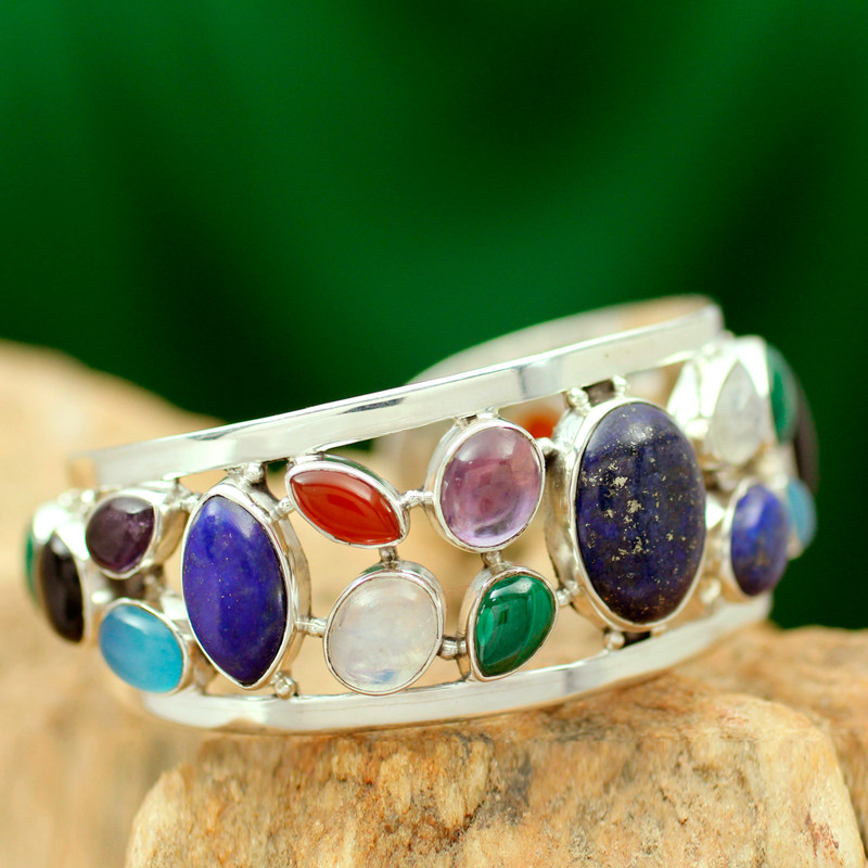 This bracelet by Neeru Goel blossoms with the splendor of colorful gemstones. They include a luscious collection of malachite, carnelian, rainbow moonstone, garnet, amethyst, and black onyx. Lapis lazuli, rose quartz, chalcedony and cultured pearl complete the medley. The gems grace a sterling silver cuff bracelet of timeless beauty.