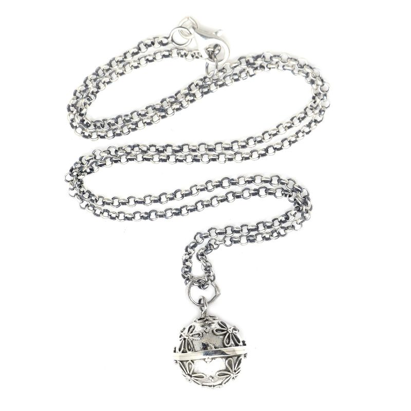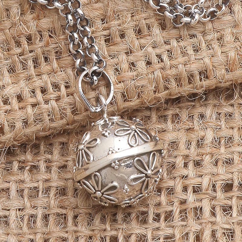 Also called "angel necklaces" and "harmony balls," Such necklaces are often worn by pregnant women in Bali and also in Mexico. Many wear it as an amulet. Others prefer a long chain that lets the pendant reach to the belly and the delicate sounds are thought to soothe the mother and the baby she is carrying. Some believe it summons a guardian angel, thus making it a symbol of loving protection.