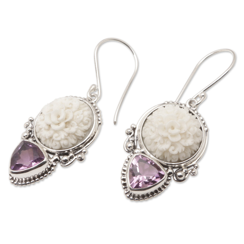 Proud of his Balinese heritage, artisan Buana handcrafts these charming sterling silver dangle earrings featuring faceted amethyst stones totaling over two carats. Then, working with cow bones, he adds tamiang ornaments, traditional decorations often present in sacred celebrations as amulets against negative energies.