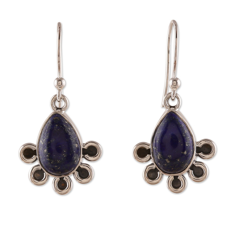 These captivating dangle earrings boast pretty lapis lazuli jewels of royal symbolism, infusing your look with majestic elegance. India's Shanker presents these unique accessories, crafted with intricate sterling silver shapes with an exquisite combination of oxidized and polished finishes.