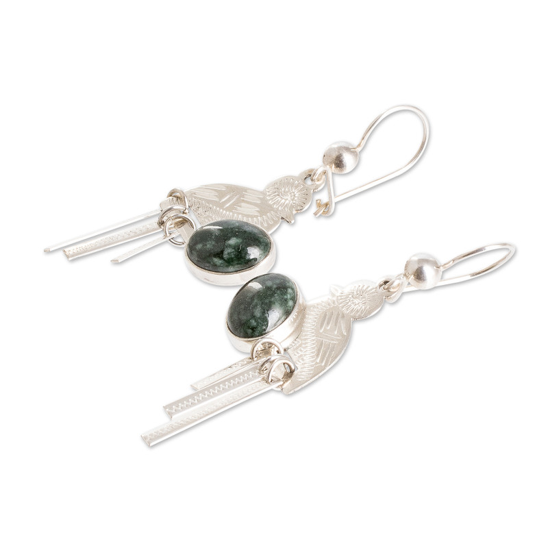 Zandra Lorena Sajbin captures the mesmerizing beauty of the quetzal, Guatemala's national bird, in these exquisite dangle earrings. The magnificent creatures are crafted from gleaming sterling silver and adorned with vibrant dark green jade stones. A truly remarkable accessory that pays homage to the natural splendor of her homeland while infusing your look with vibrant color and exquisite charm.