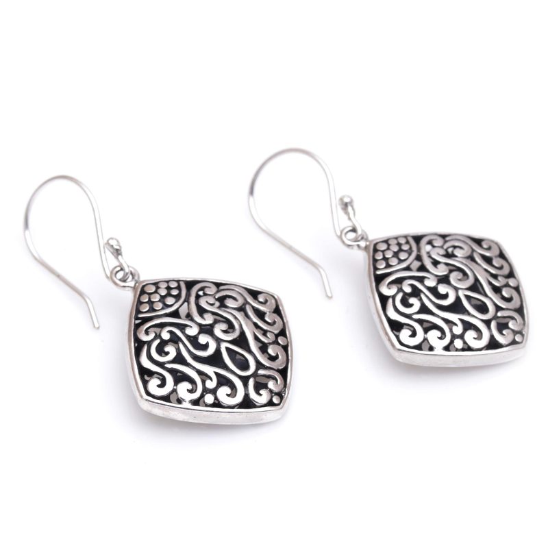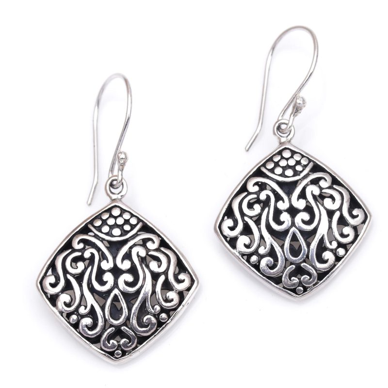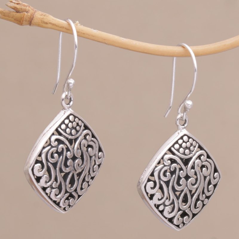 Backed by our 100% Happiness GuaranteeThese sterling silver dangle earrings have an elegant curved diamond shape. Bali's Dewa Arimbawa handcrafts the pair with elaborate, detailed scroll work.