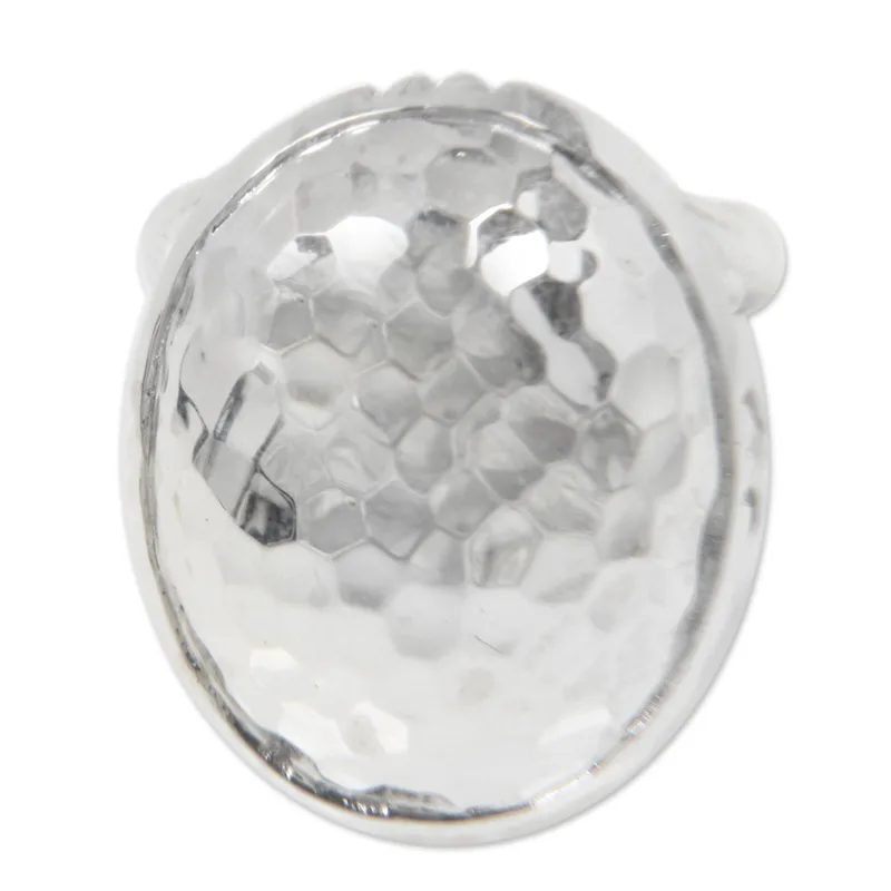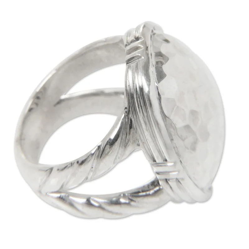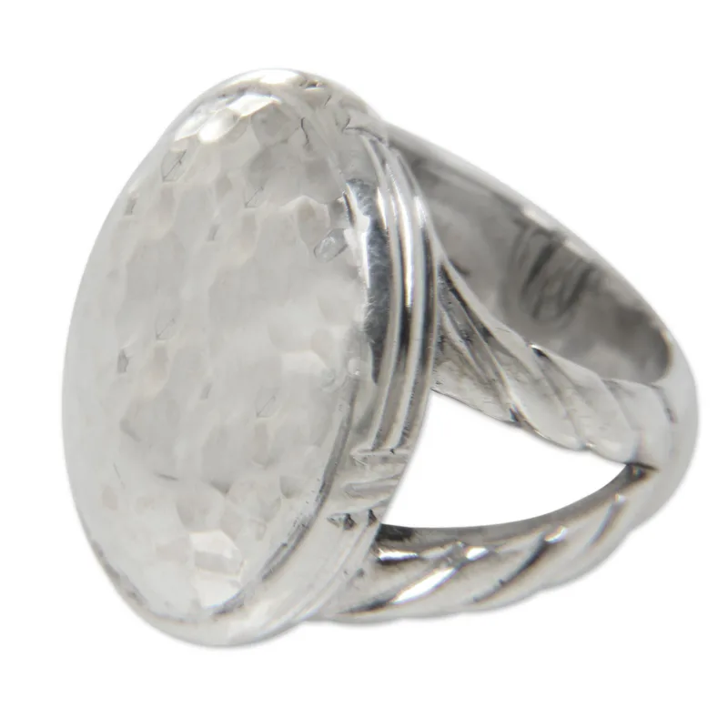 Nyoman Ariawan in Bali designs this spectacular ring featuring a convex crown with a hammered surface. Ariawan works in sterling silver to craft a ring with a rope-like band.