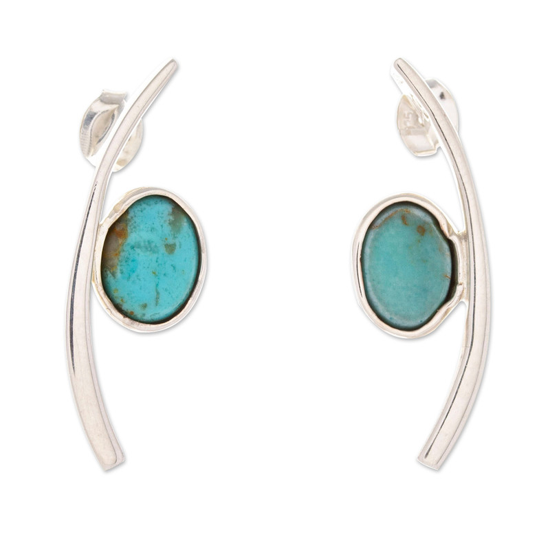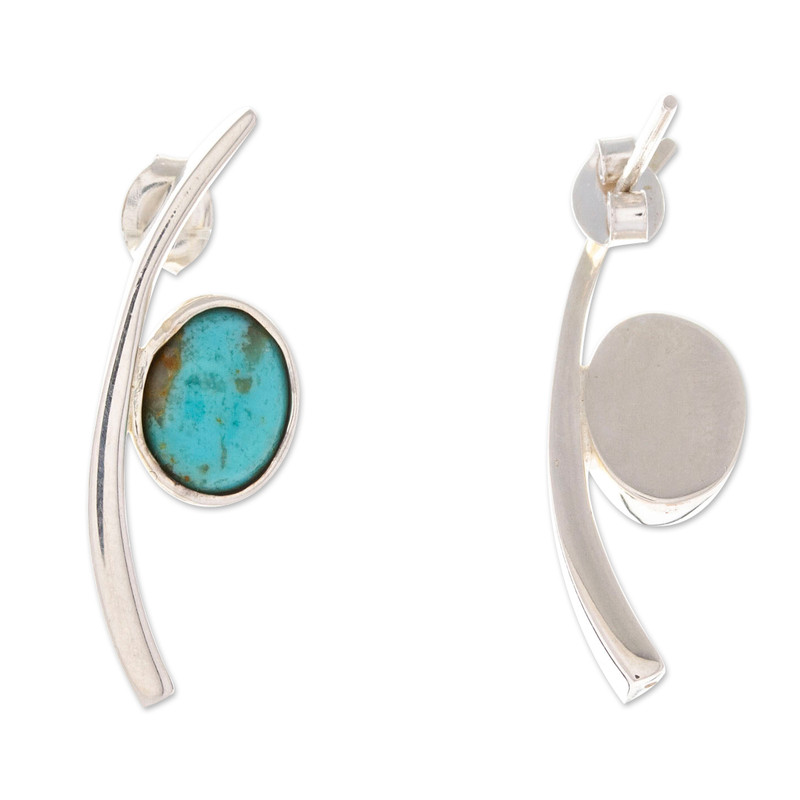 Elegant formations enrich the sophisticated beauty of these drop earrings by Mexico's Ezequiel Tapia. The artisan draws inspiration from modern trends to create these sterling silver pieces, polishing everything for a luminous look. The central elements are reconstituted turquoise stones, whose oval shape and refreshing colors capture the peaceful essence of an ethereal lagoon.