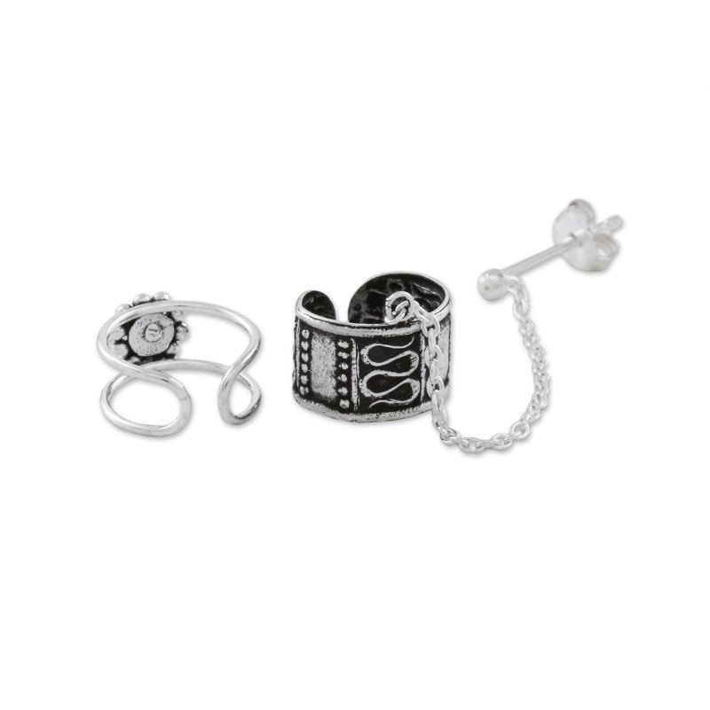 Presented by Thailand's Wadarat Supasirisuk, these ear cuffs will add a sweet strength to your wardrobe. Crafted of sterling silver, the ear cuffs feature patterned designs on one and a floral crown on the other, accentuated by a combination of finishes. The patterned cuff features a dangling sterling chain that adorns the earlobe on a post.