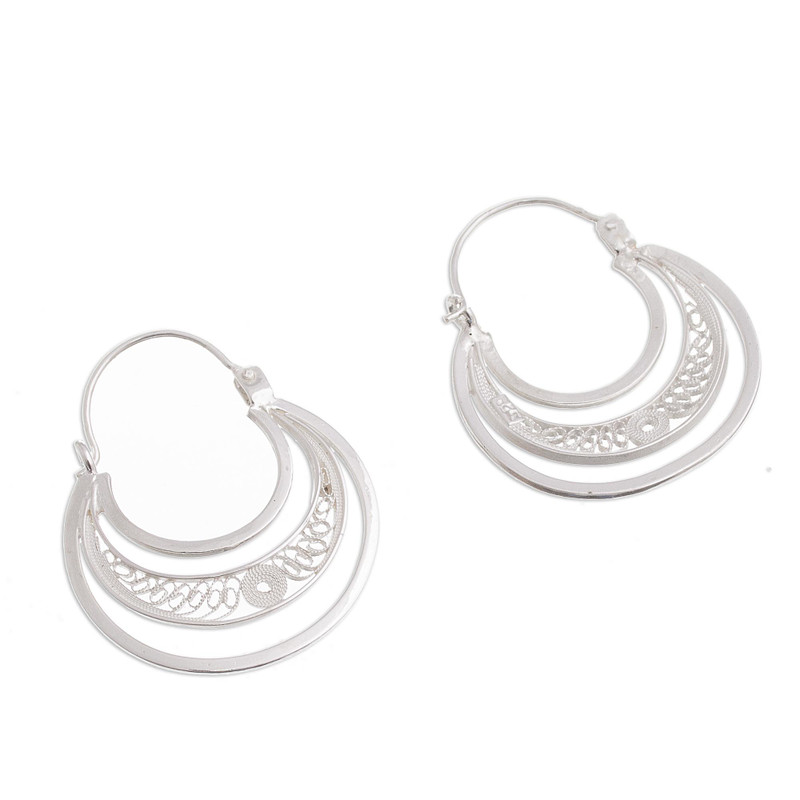 Crafted of sterling silver with intricate filigree work, two artisanal crescent moons caress the ears in this pair of hoop earrings from Peru. Alfredo Inga creates this beautiful accessory.