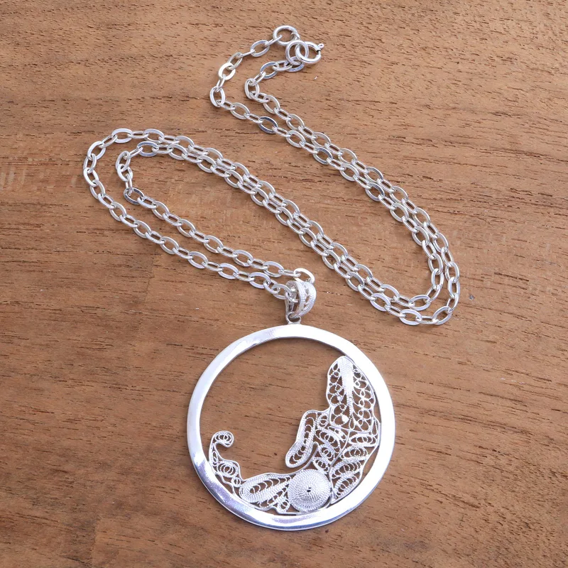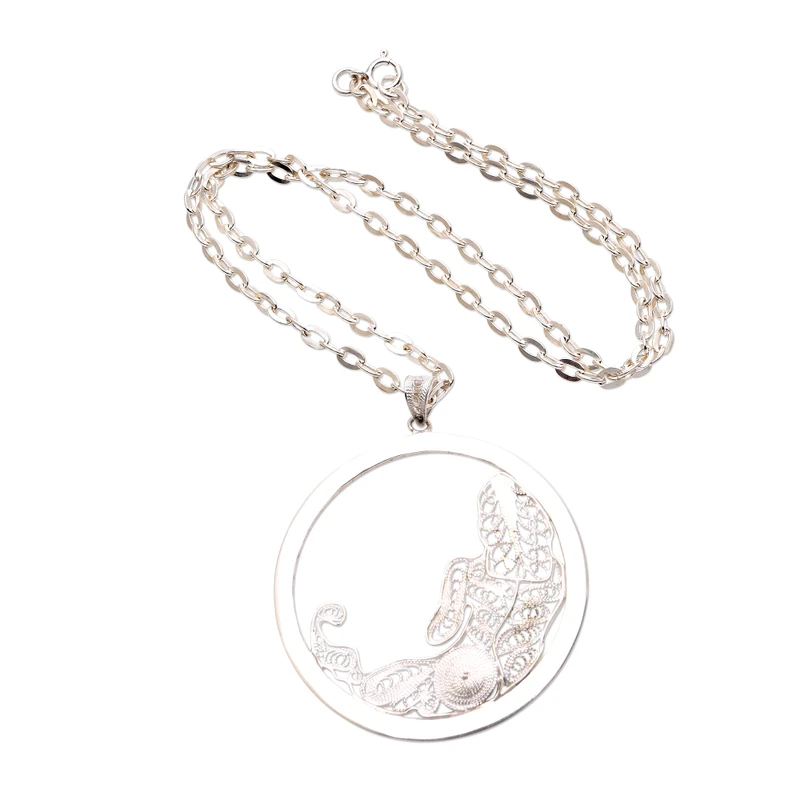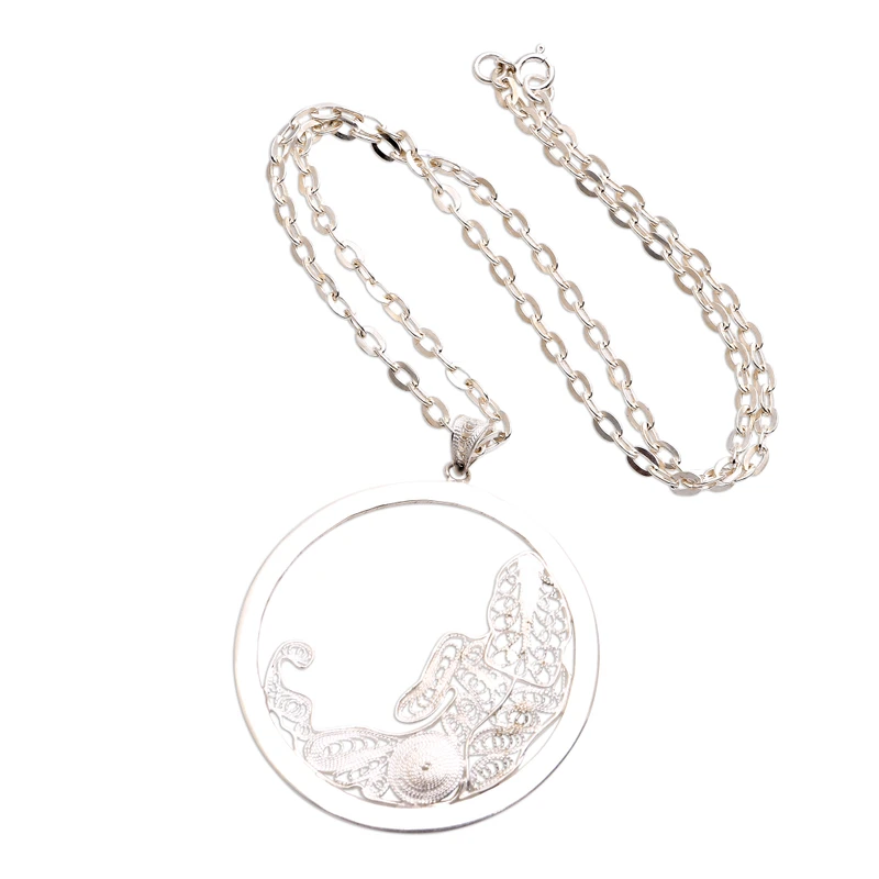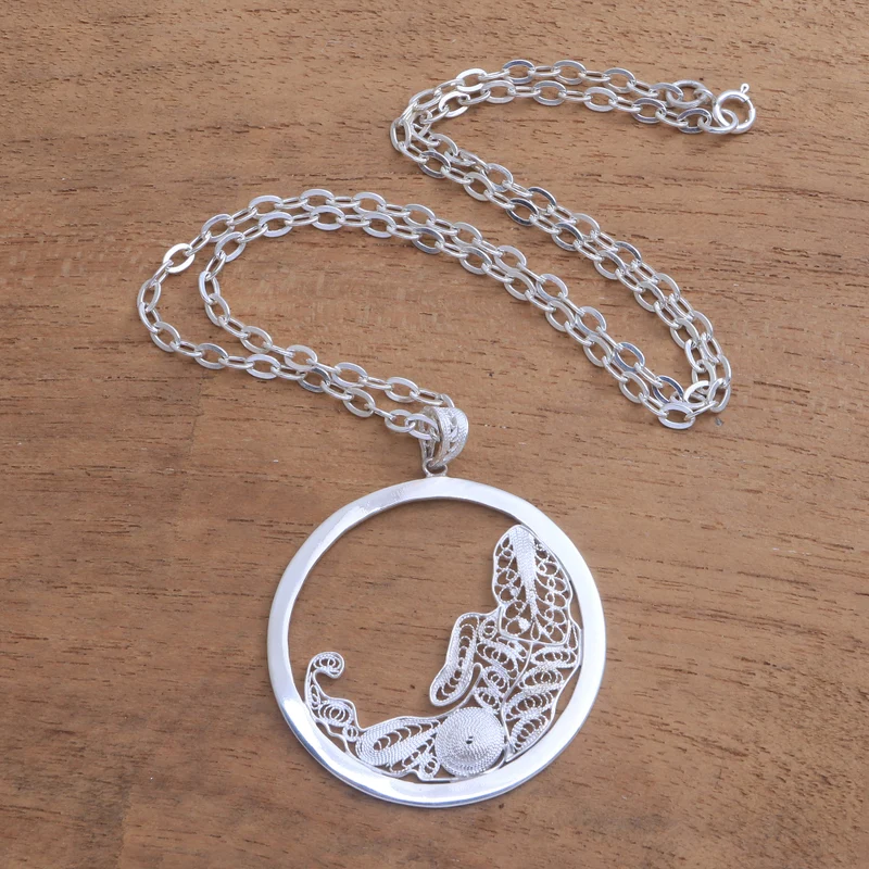 Handcrafted of sterling silver filigree, the symbol for the zodiac sign Virgo, a young maiden, is realized within the circular pendant of this necklace. Javanese artisan Selly Sagita designs this necklace for the Virgo in your life. This accessory circles the neck on sterling cable chain.