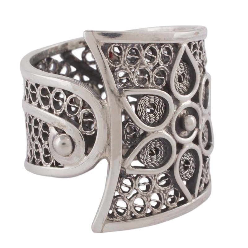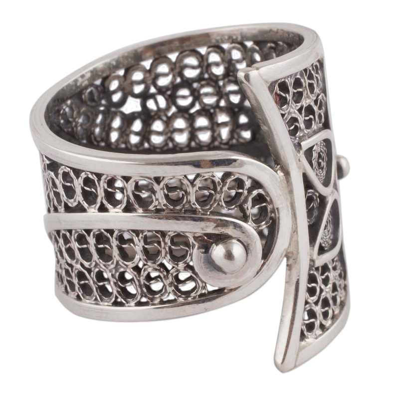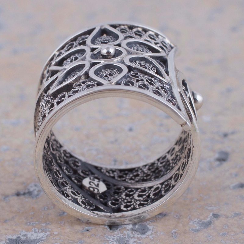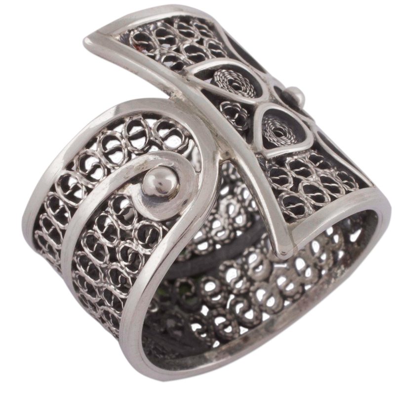 Backed by our 100% Happiness GuaranteeWorking alongside family members, Peru's Paola Siza designs a beautiful, striking band ring. A blooming flower vine is handcrafted on an intricate filigree vine of sterling silver. Artistic and stunning, this ring makes a statement wherever it goes.