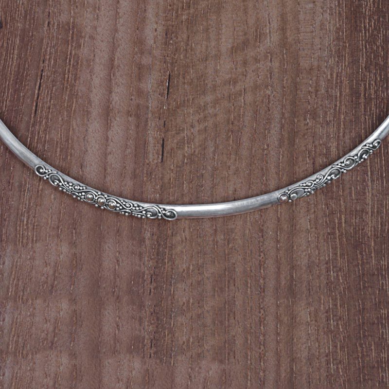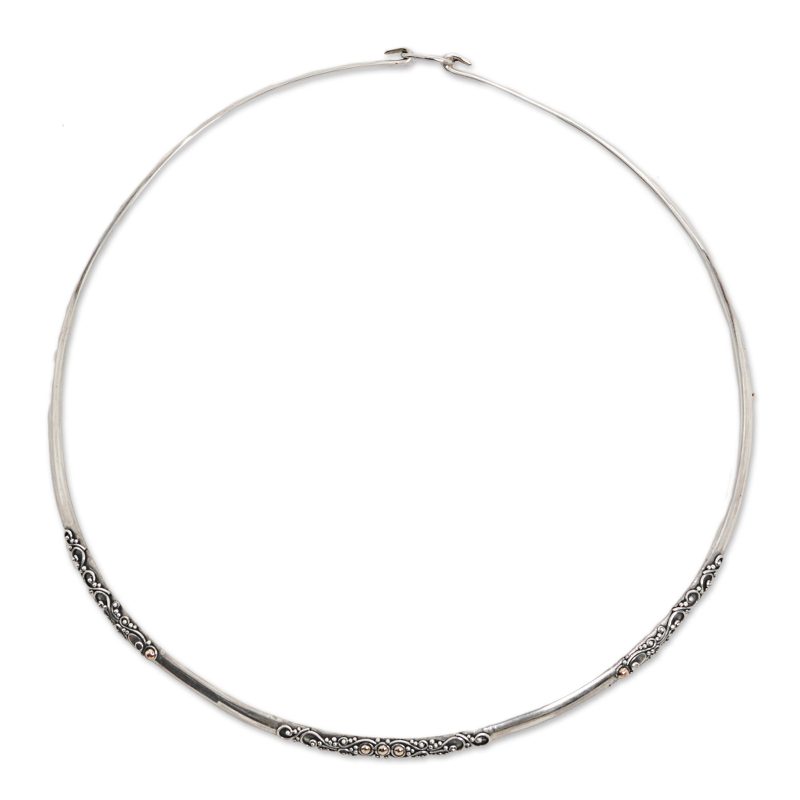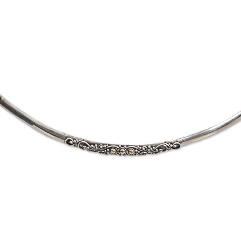 Working alongside her family, Made Sudiari is an artisan from Indonesia who designs and crafts wonderful pieces of jewelry. She presents this collar necklace, handcrafted from sterling silver and decorated with intricate swirl motifs. 18k gold plated accents adorn parts of the necklace for a beautiful two-tone look.