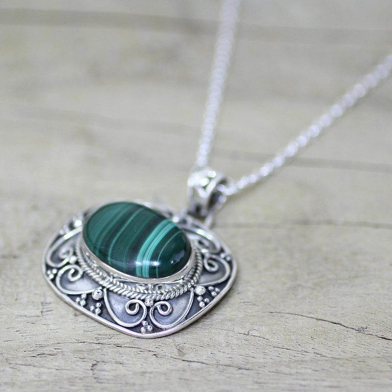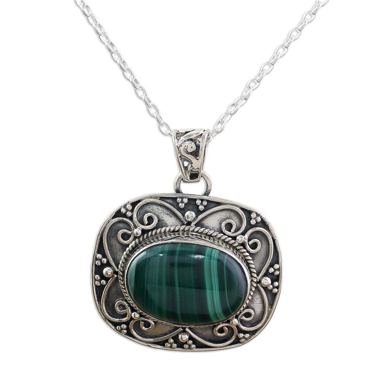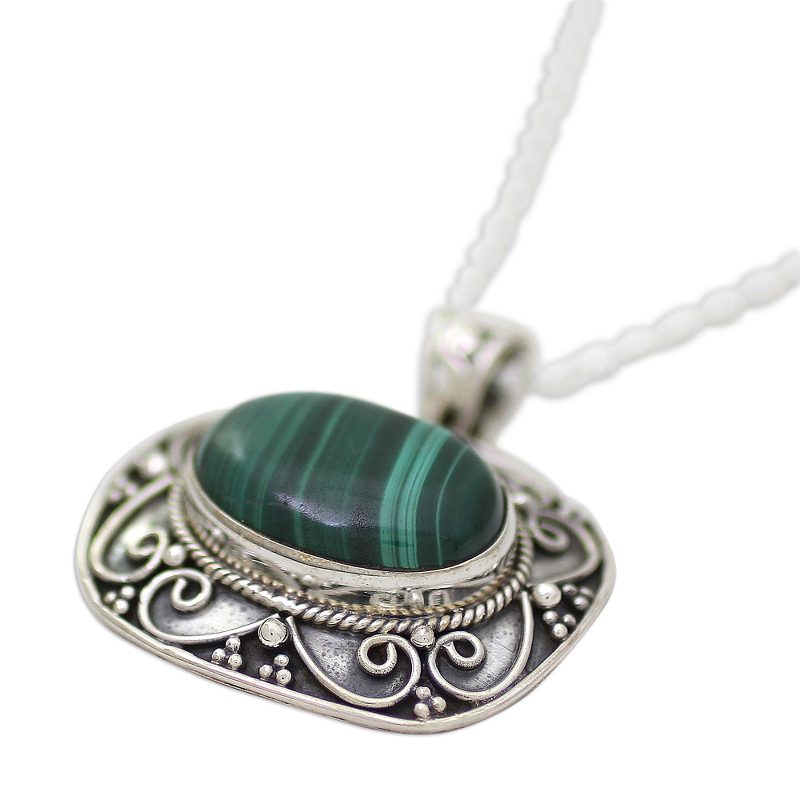 Encircled with an intricate rope detail and four unique tendril and ball patterns, this majestic, bezel-set malachite and sterling silver pendant is sure to catch eyes. This gorgeous green gemstone is believed to alleviate a number of ailments such as moodiness, general pains, high blood pressure, and even arthritis. The pendant includes a cable chain connected by a swirled bale that completes the traditional Indian design by artisan Alok Jain.
