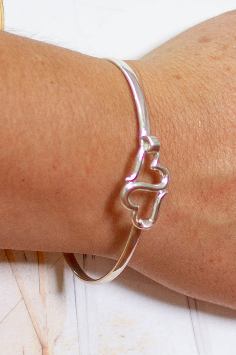 Designed by Mexican artisan duo Graeme and Philip Watson, this bracelet encircles the wrist with a simple bangle of sterling silver, centered by two harmonious hearts that act as a hook clasp. This accessory is crafted in the tradition of Taxco silversmithing.